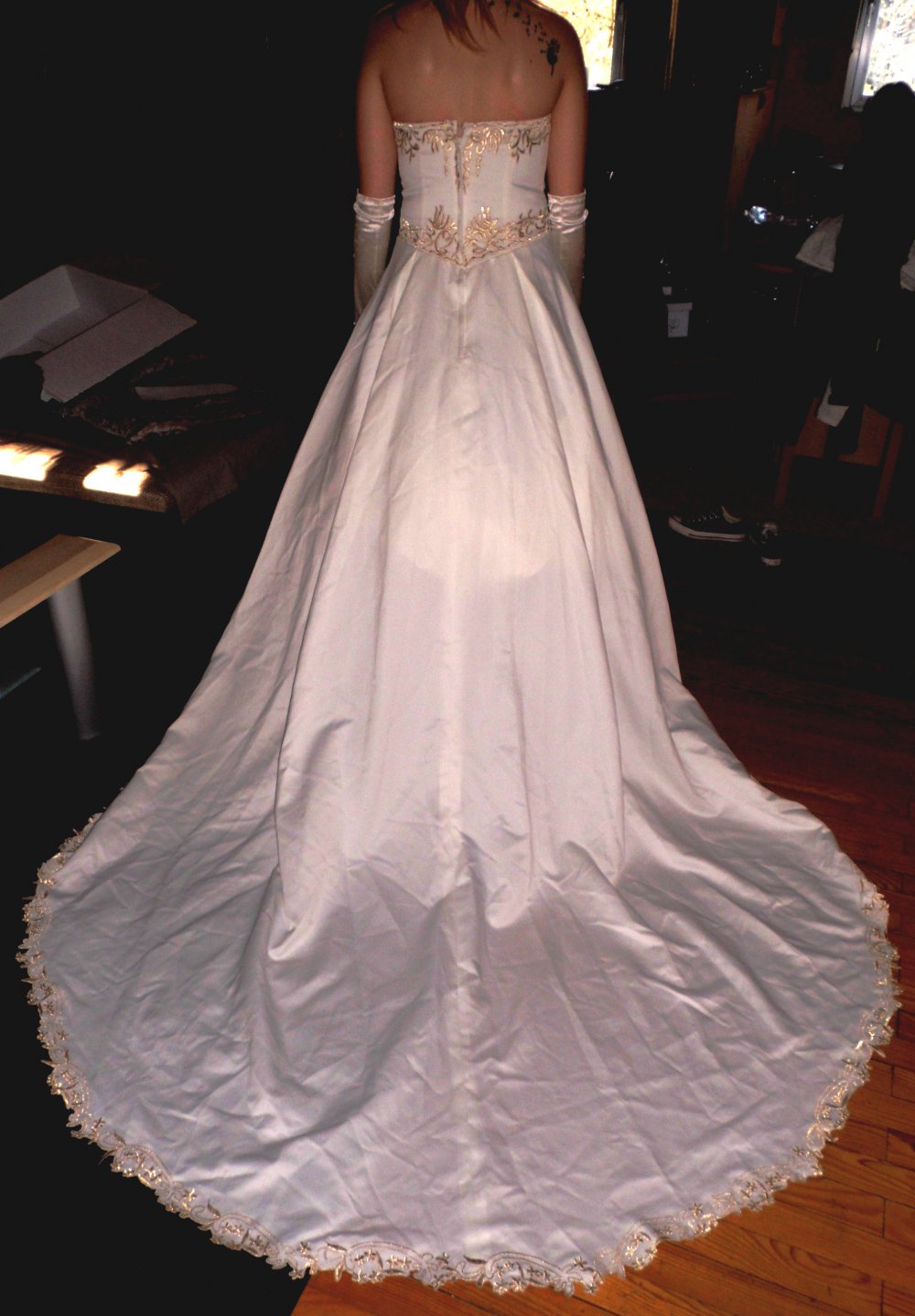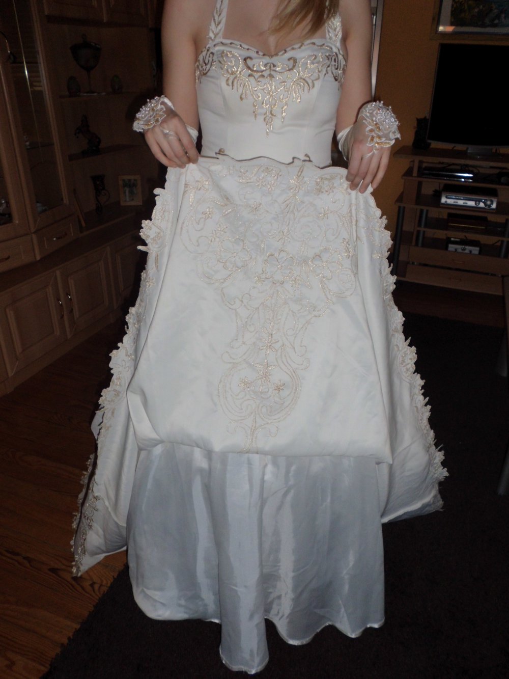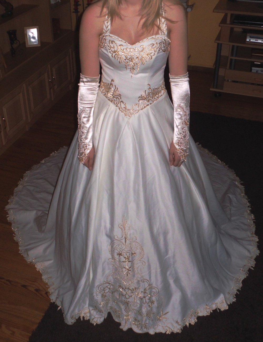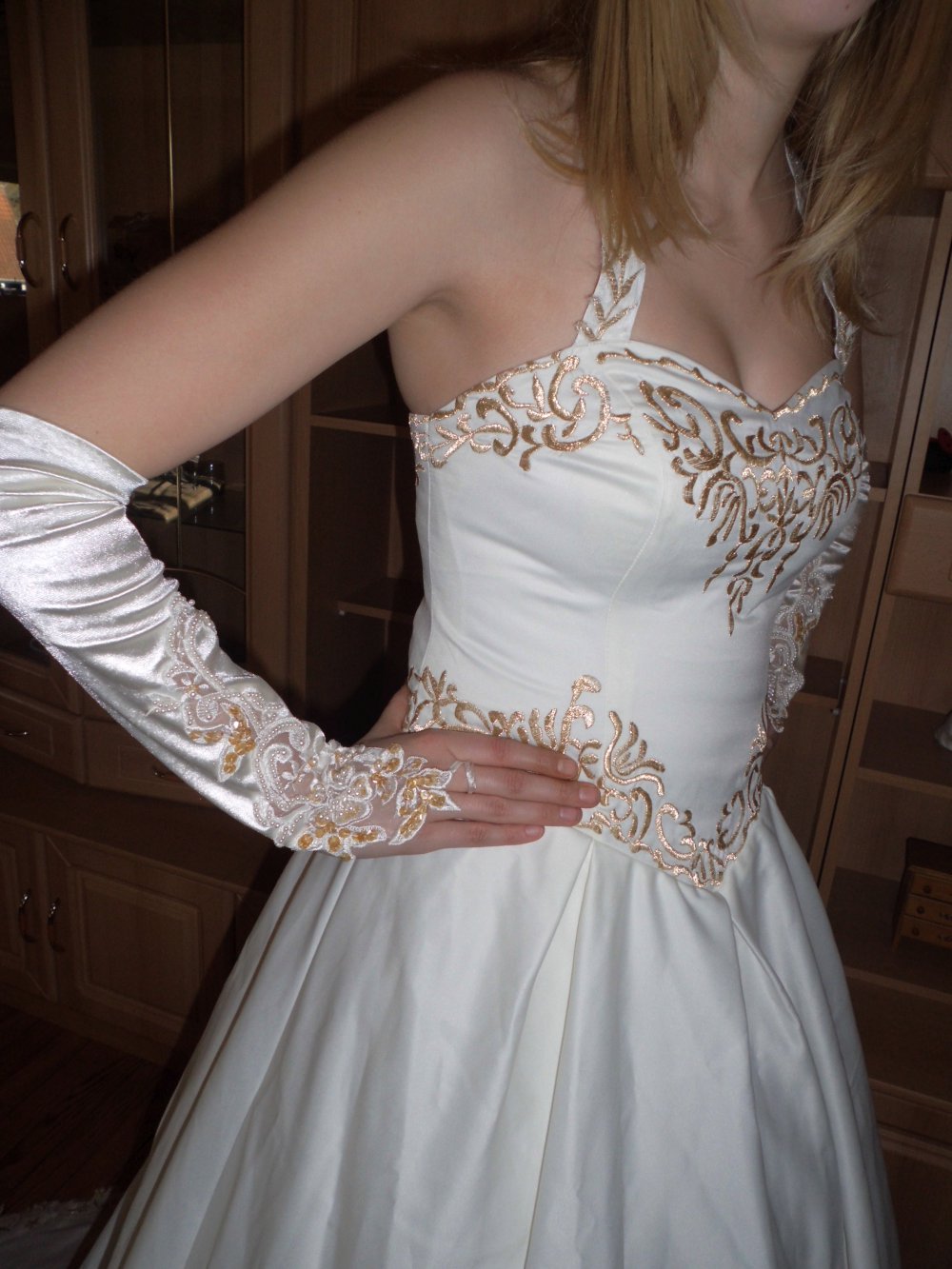 Brautkleid in italenischer Stil angefertigt (Einzelstück), aus Seide mit goldenen Spitzen gestickt.