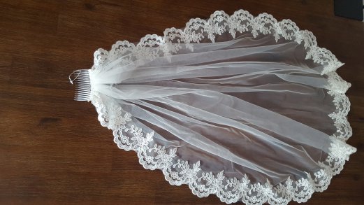 Der Schleier ist neu und ungetragen, ich habe ihn zu meinem Brautkleid (auch mit Spitze in "Ivory" in der Traumfabrik in Bochum gekauft. Der Neupreis war 139,00 €. Es soll sich um ein spanisches Model handeln.