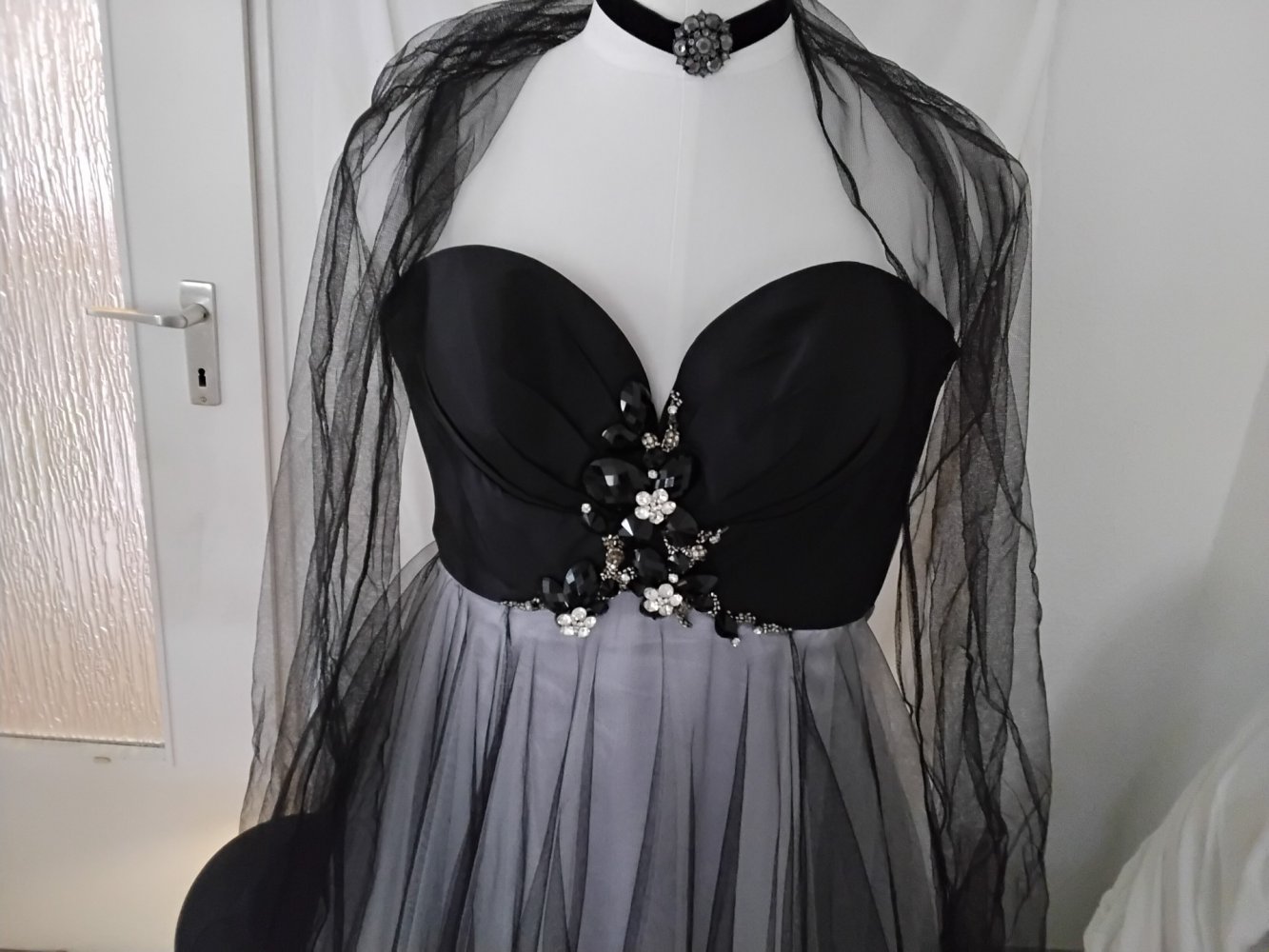 Traumhaftes Festkleid, Corsage, iralen Perlenn schwarz-weiß, mehrere lagen Tüll und Satinrock, vorne reich bestückt mit Muster