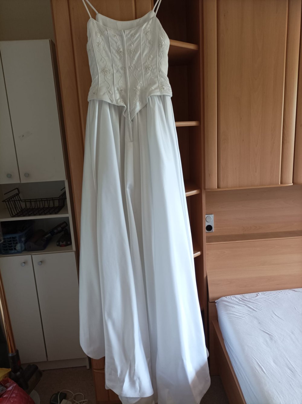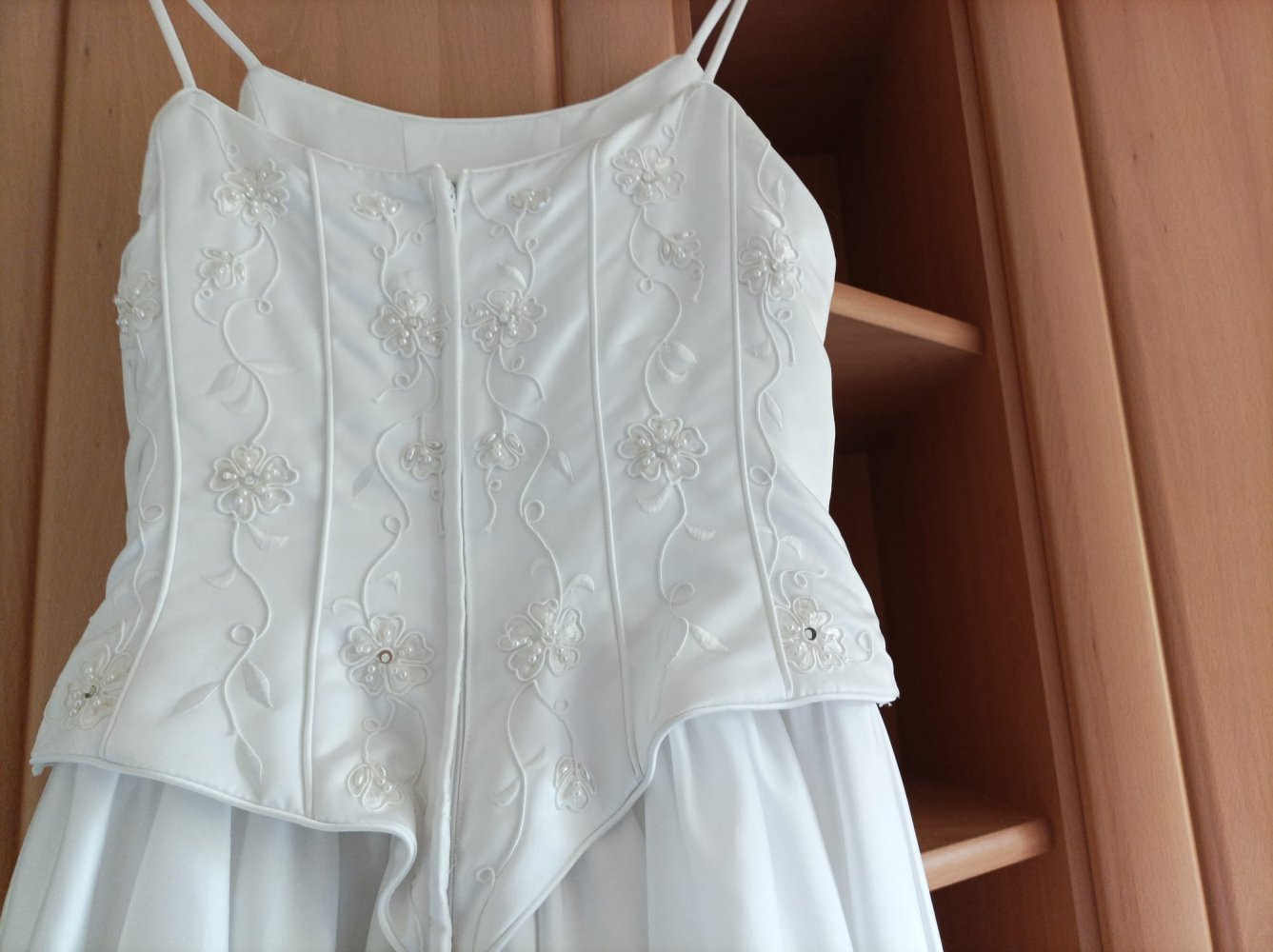 Vom Design her klassisch schlicht in strahlendem Weiß mit bezaubernd verzierter Corsage. Es wird hinten mi Reißverschluss verschlossen.