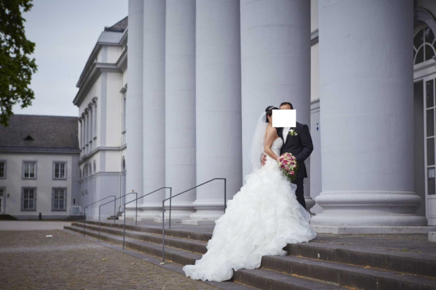 Das Kleid ist sehr figurbetont; durch die schräge Korsage an der linken Hüfte bringt es die Figur noch mehr zur Geltung. Außerdem hat es eine glamouröse lange Schleppe, bei der die Volants unglaublich toll wirken. Die Schleppe kann auf Wunsch ganz einfach hochgesteckt werden (s. Bilder). Eine Tanzschleppe befindet sich auch an dem Kleid. Das Kleid wurde bereits professionell gereinigt u. befindet sich in einem absolut einwandfreien Zustand.