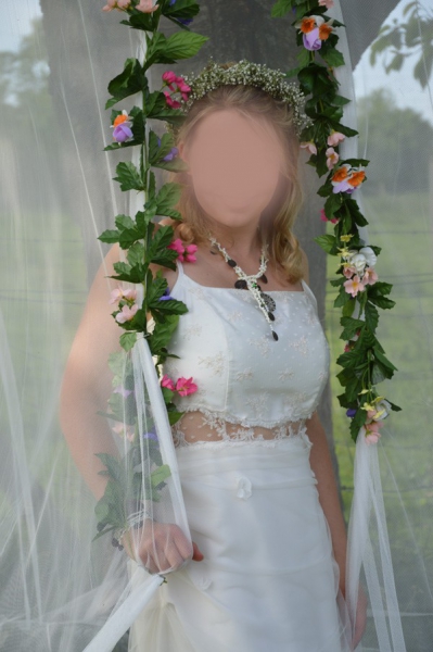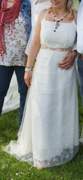Das creme-weiße Kleid wurde in Bielefeld in der Brautmodenboutique "Catharina" designed und hergestellt (Neupreis lag bei 1200Euro).