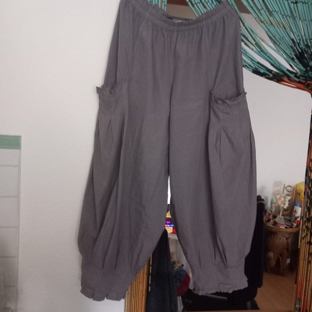Biete diese super bequeme, weite Hose, im Lagenlook Style. Diese Hose kam auch zum Einsatz. Durch den Gummizug Bund kann diese Hose von einer Gr. 38 - 42 getragen werden. Der genaue Farbton ist ein Blau/Grau. Hier noch einige Maßangaben: