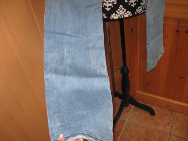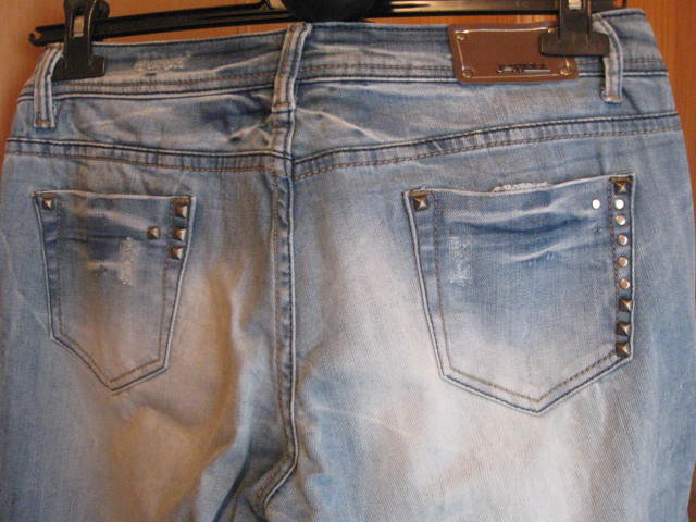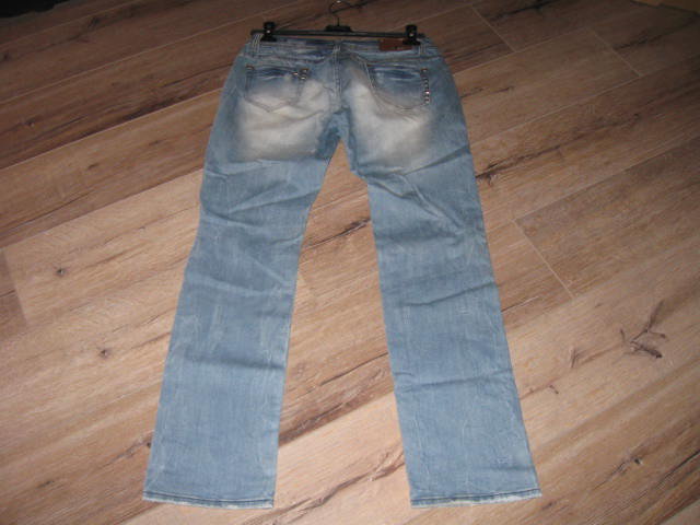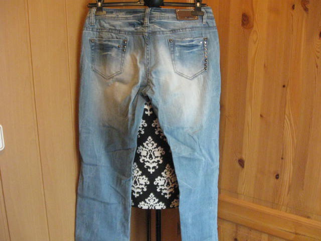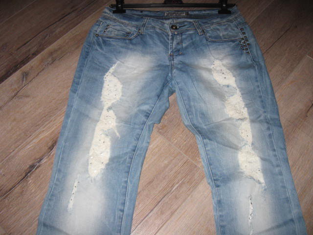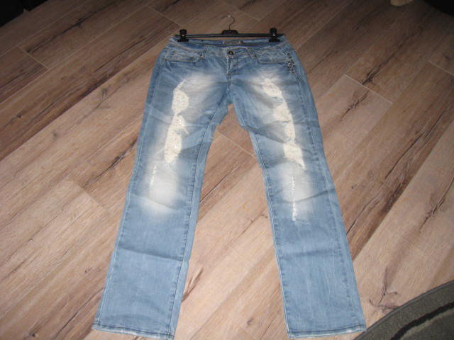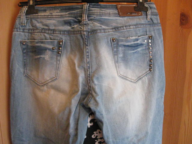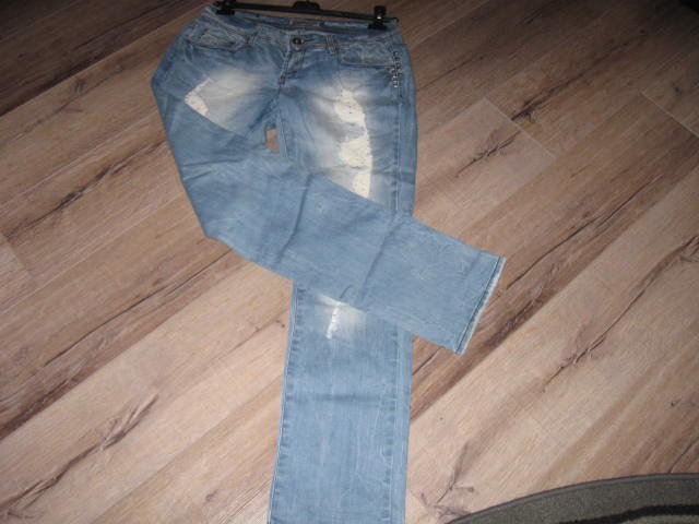 Biete eine wenig getragene Jeans, die im vorderen Bereich mit Rissen versehen ist. Diese Risse sind mit Stoff unterlegt und mit Steinchen verziert. Die Jeans besitzt einen geraden Schnitt. Mit der Gr. XL ausgezeichnet, fällt aber kleiner aus, eher wie eine Gr. L. Hier einige Maßangaben:
