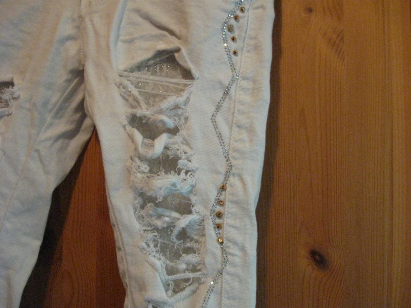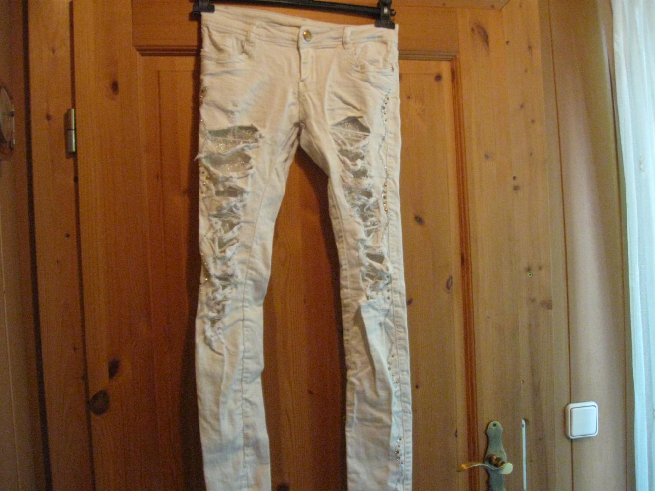Biete diese fantastische Fetzen Röhren Jeans. Die Löcher sind mit Weiß/Silber Spitze unterlegt, des weiteren ist diese außergewöhnliche Jeans an den Außenseiten mit kleinen silberen Steinchen und goldenen Nieten verziert. Hier noch einige Maßangaben:
