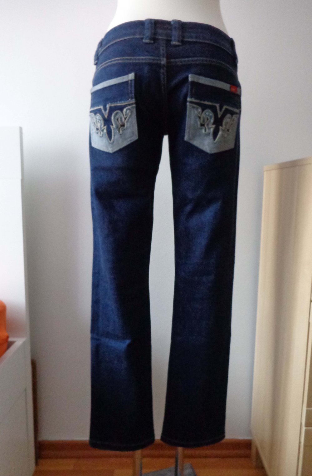 Dunkelblaue Jeans mit Verzierung an den Po-Taschen. Ich habe die Jeans zweimal getragen. Sie ist in einem einwandfreien Zustand.