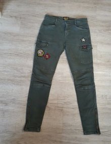 Khakifarbene Jeans mit Aufnähern und goldenen Perlen an den Taschen sowie am unteren Bein