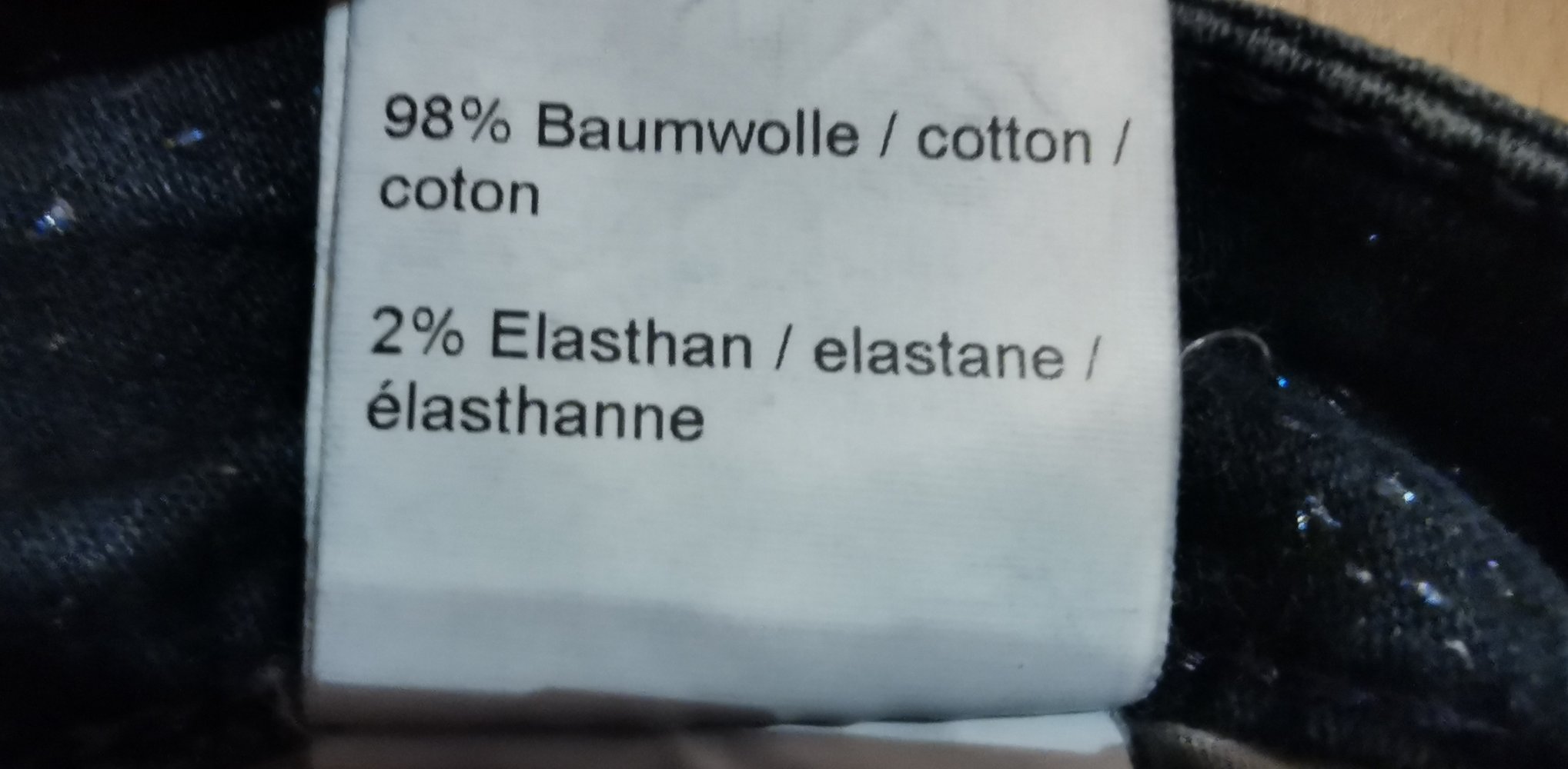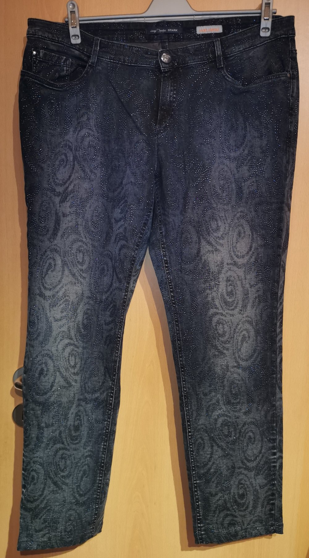 Ich biete diese dunkelblaue Stretchjeans von stark an. Sie hat die Größe 46, hat zwei Eingriffs- und Gesäßtaschen. Die Jeans besitzt ein Paillettenmuster.