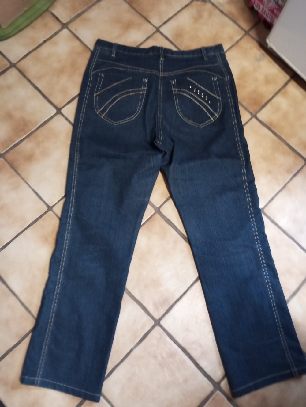 Jeans mit geraden Beinschnitt, auf der hinten Tasche kleine Zierplättchen.