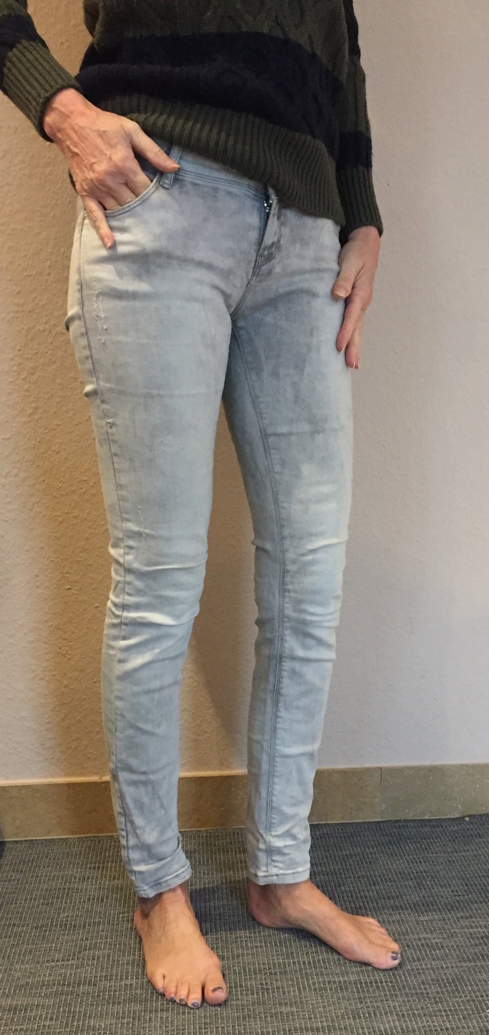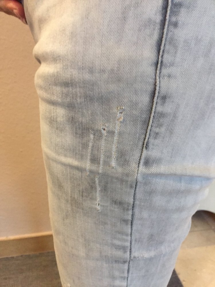 siehe Fotos, der Destroyed Look wirkt wie Laufmaschen im Stoff ist aber vom Hersteller so gewollt und stellt keinen Makel da. Farbe hellgrau meliert.