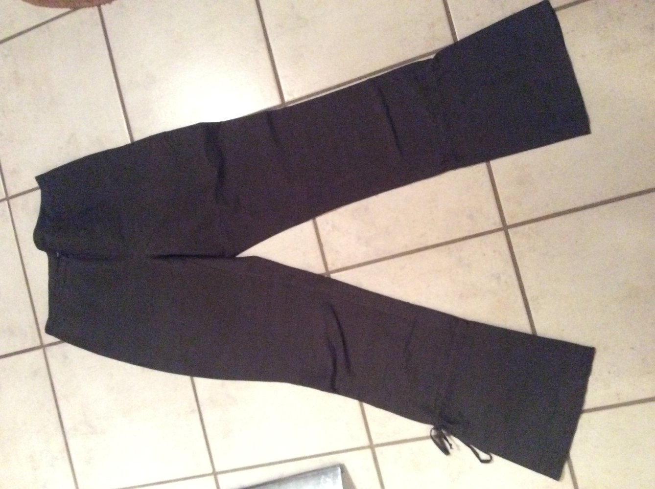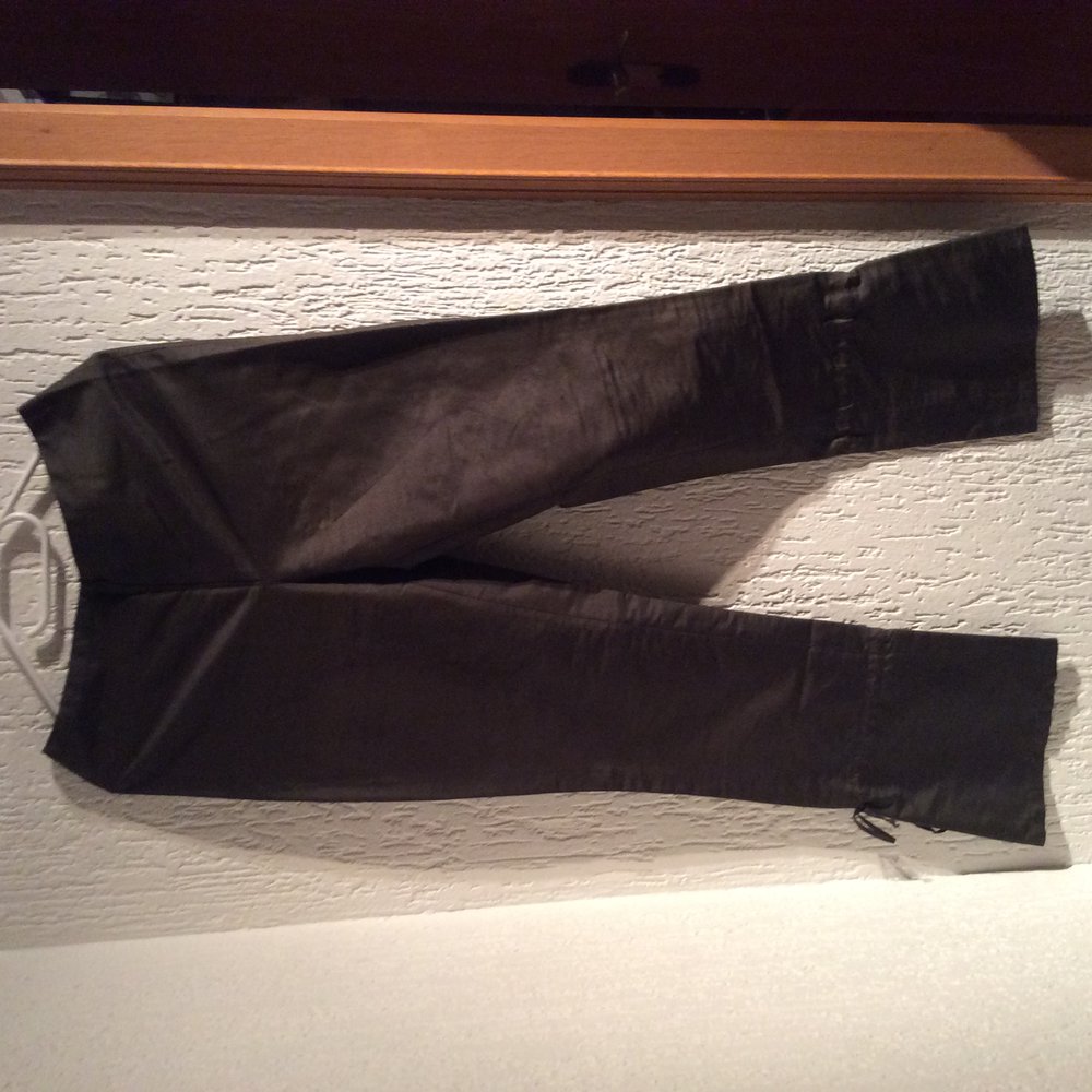 Die Hose hat am unteren Teil , seitlich außen schnürre zum raffen