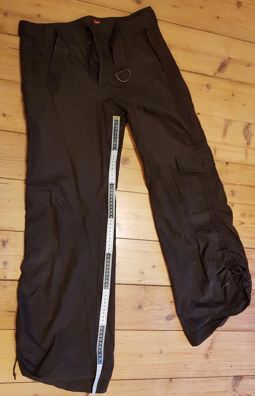 Die Hose hat einen weiten, aber geraden Schnitt, die Beinlänge kann mit Hilfe von Schlaufen auf der Beinaußenseite verkürzt werden (s. Bild). Auf Oberschenkelhöhe gefinden sich 2 seitlich aufgesetzte Taschen. Die Hose ist mit einem Stoffgürtel zu binden.
