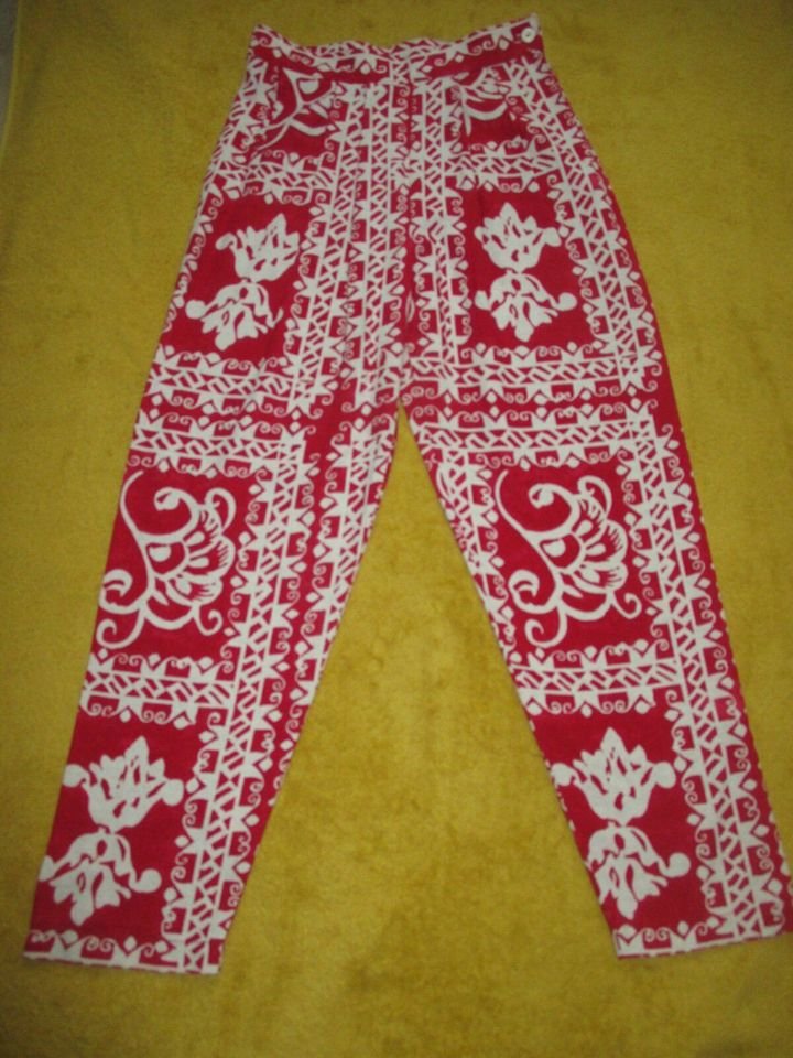 NEU * Edel * Original 1980er VINTAGE * Phantasie- Print * DESIGNER * Leinen * Karotten * High Waist * Bundfalten * Hose * Gr. 34- 36/ XS * rot * natur- weiß *
