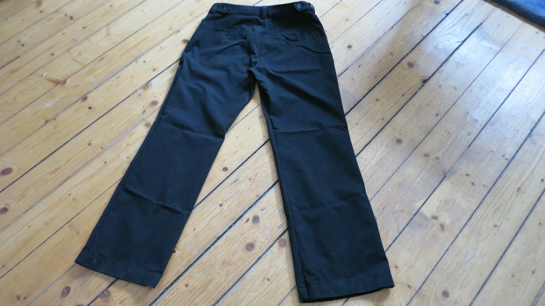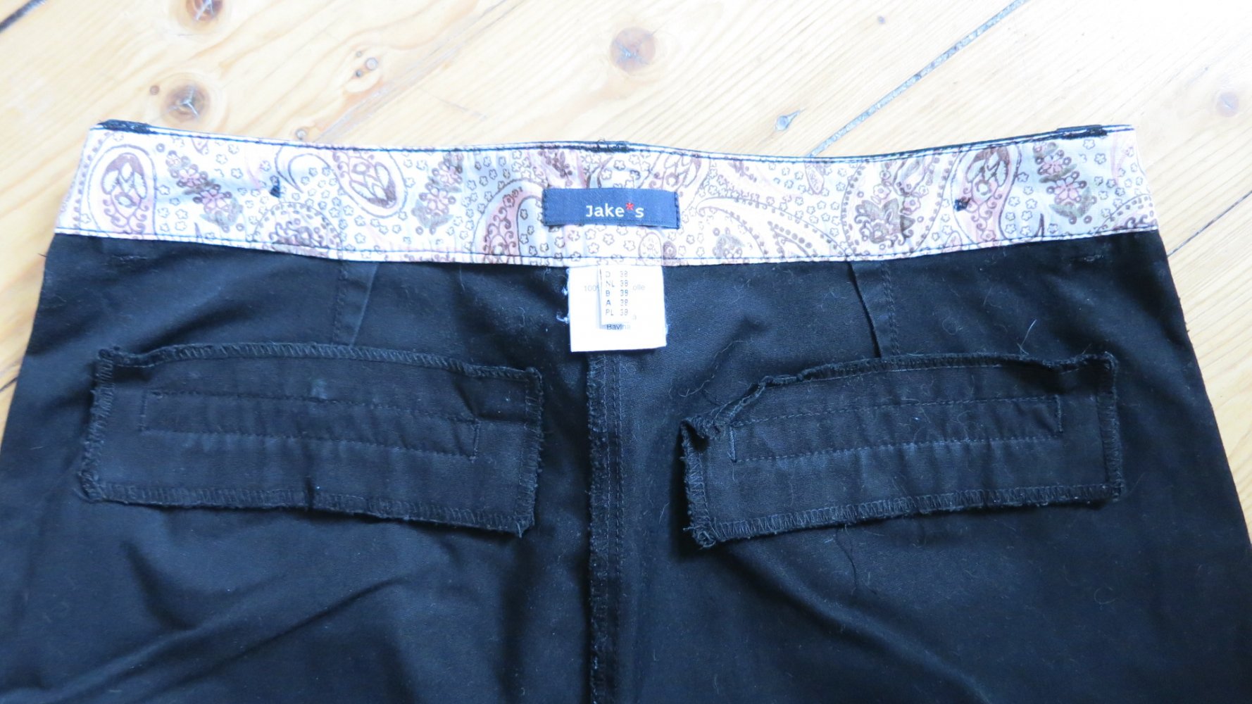 Schwarze, gut erhaltene Damen-Stoffhose in der Größe 38 der Marke Jake*s. Die Hose aus 100 % Baumwolle hat einen wunderschönen Bund von Innen. Sie hat auf der Vorderseite zwei aufgenähte Taschen, auf der sich eine Art Zierschlaufe befindet. Sie wird vorne mit einem schwarzen Kunststoffreißverschluss und der Bund mit einem schwarzen Knopf verschlossen. Die Taschen auf der Rückseite sind Attrappen. Am Bund auf der Rückseite befinden sich ebenfalls seitlich zwei Schlaufen, die keine Funktion haben. Sie ist etwas hüftig geschnitten und hat ein gerade geschnittenes Bein. Der Stoff fühlt sich ähnlich wie Samt an. Beachten Sie bitte folgende Maßangaben: