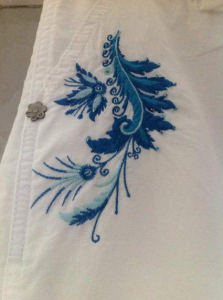 Schön weit ausgestellte Hose von EDC by Esprit. Leichte Sommerhose in strahlendem Weiß und mit blauen Stickereien und Perlen verziert. Aufwendige Verarbeitung, zwei Eingriffstaschen vorn, Gürtelschlaufen und Abnäher um die Knie. Palazzohose, Marlenehose. Perfekt für den Sommer, da es leichter, dünner Stoff ist. Modell Embro Techni.