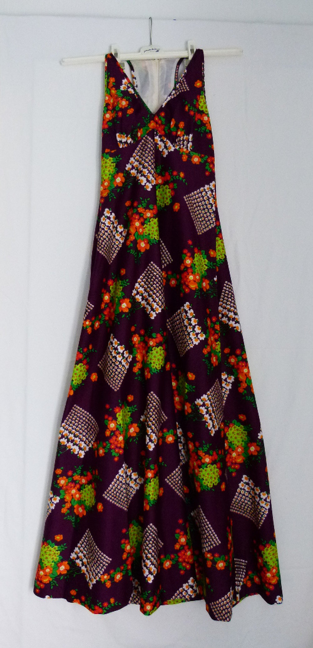 70er Jahre Abendkleid Sommerkleid, violett bunt mit Blumenmuster, Vintage Retro Boho Hippie Mori Goa Festival Unikat 70s