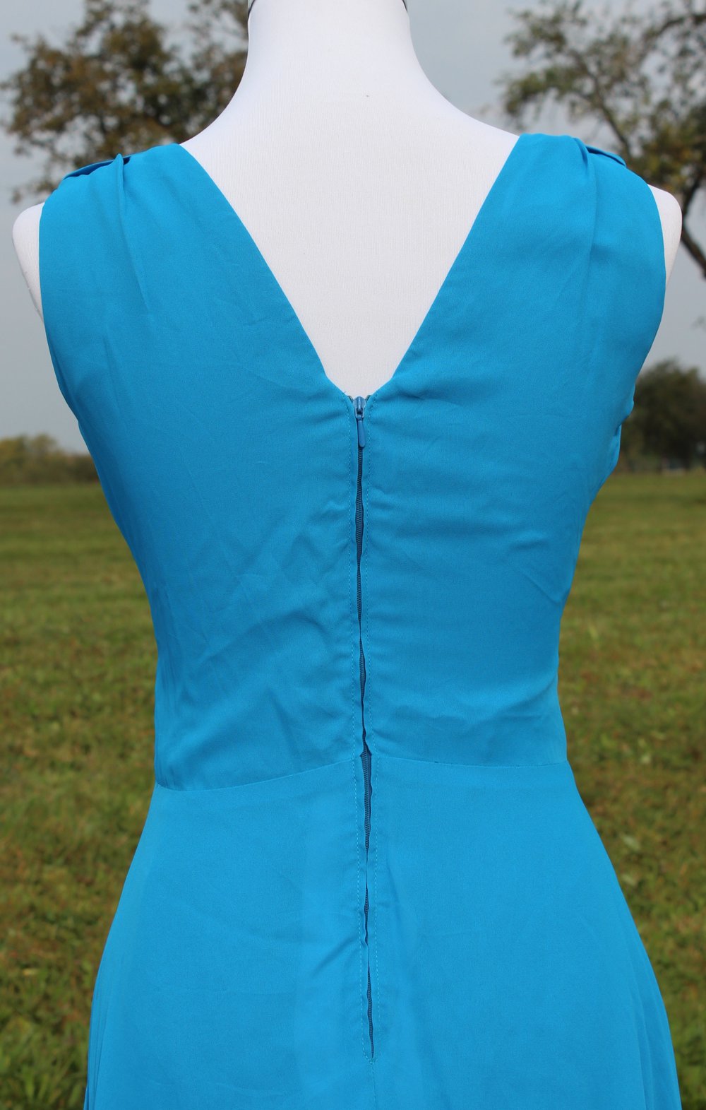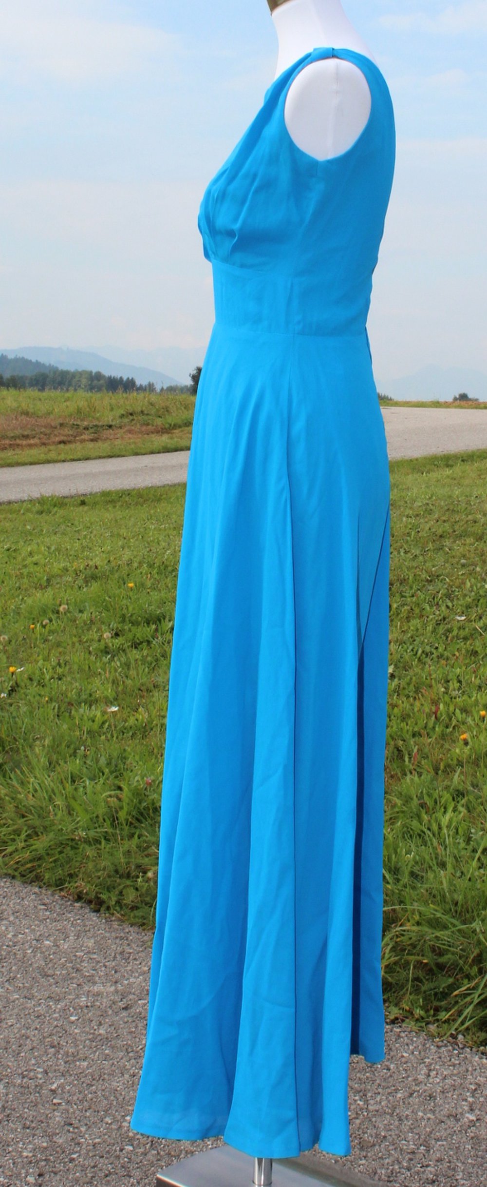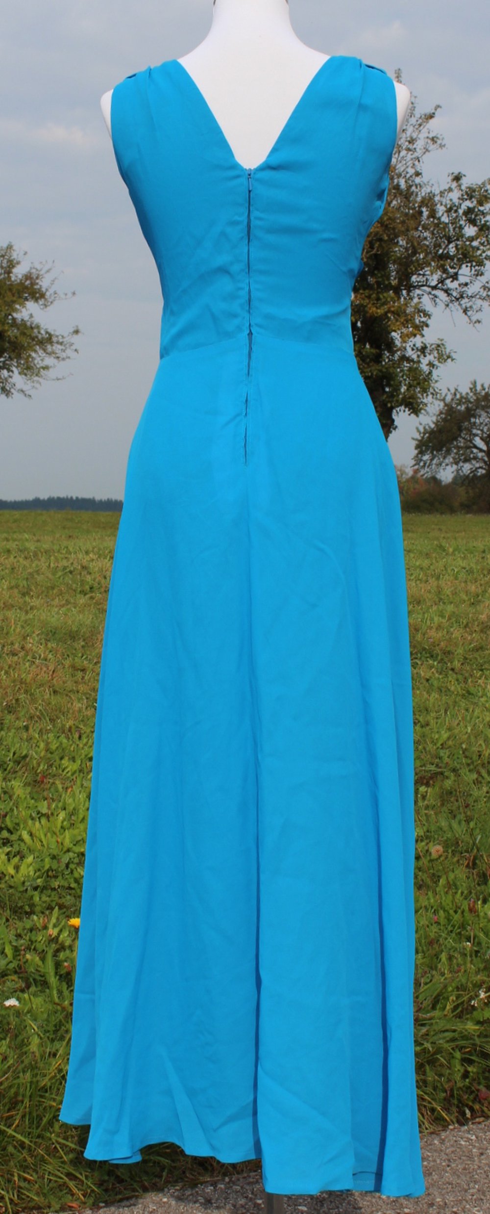 *) Es handelt sich um ein elegantes langes Kleid, das in einem kräftigen Hellblau gehalten ist.