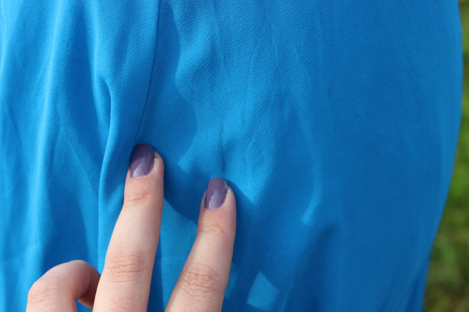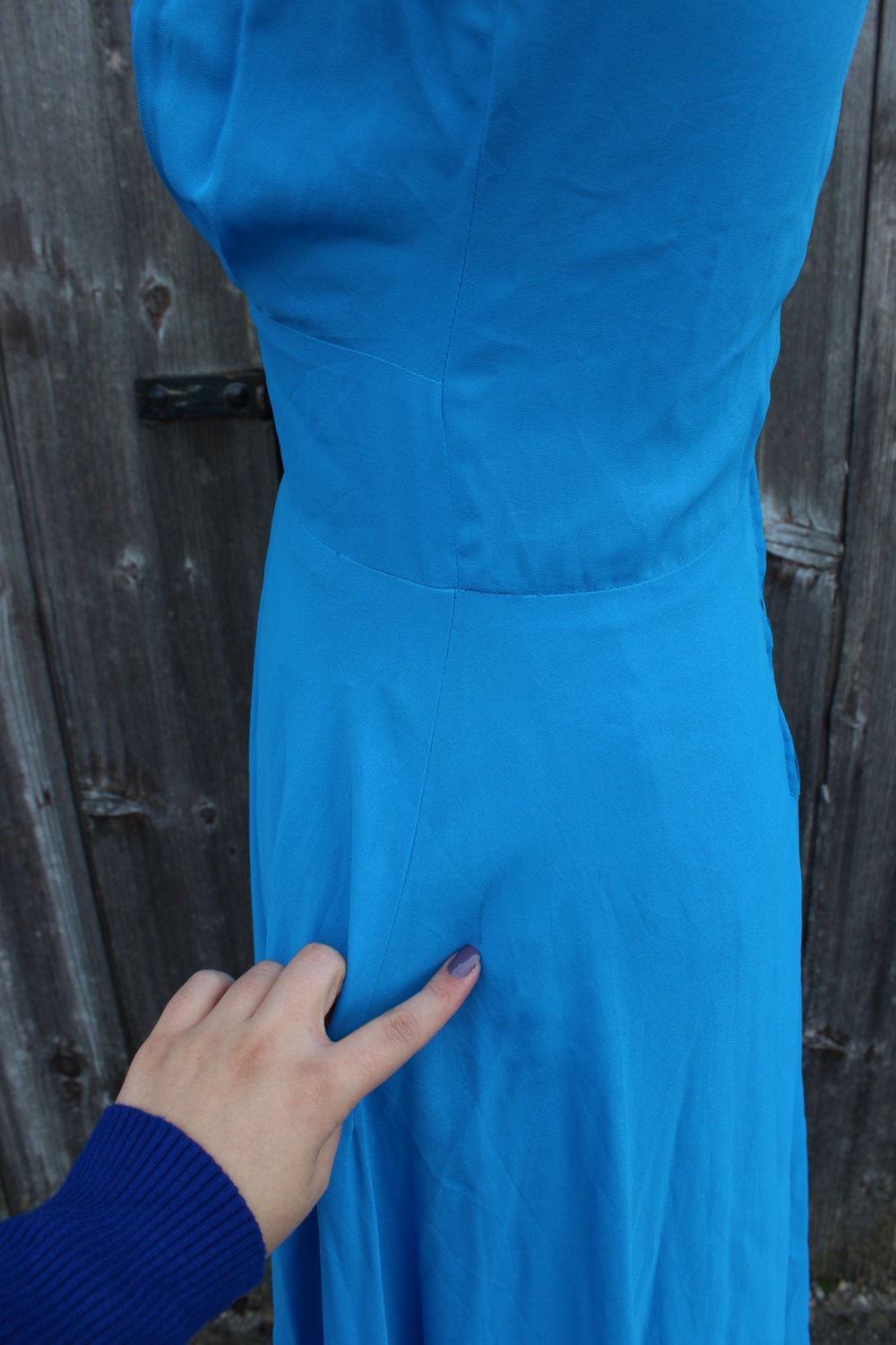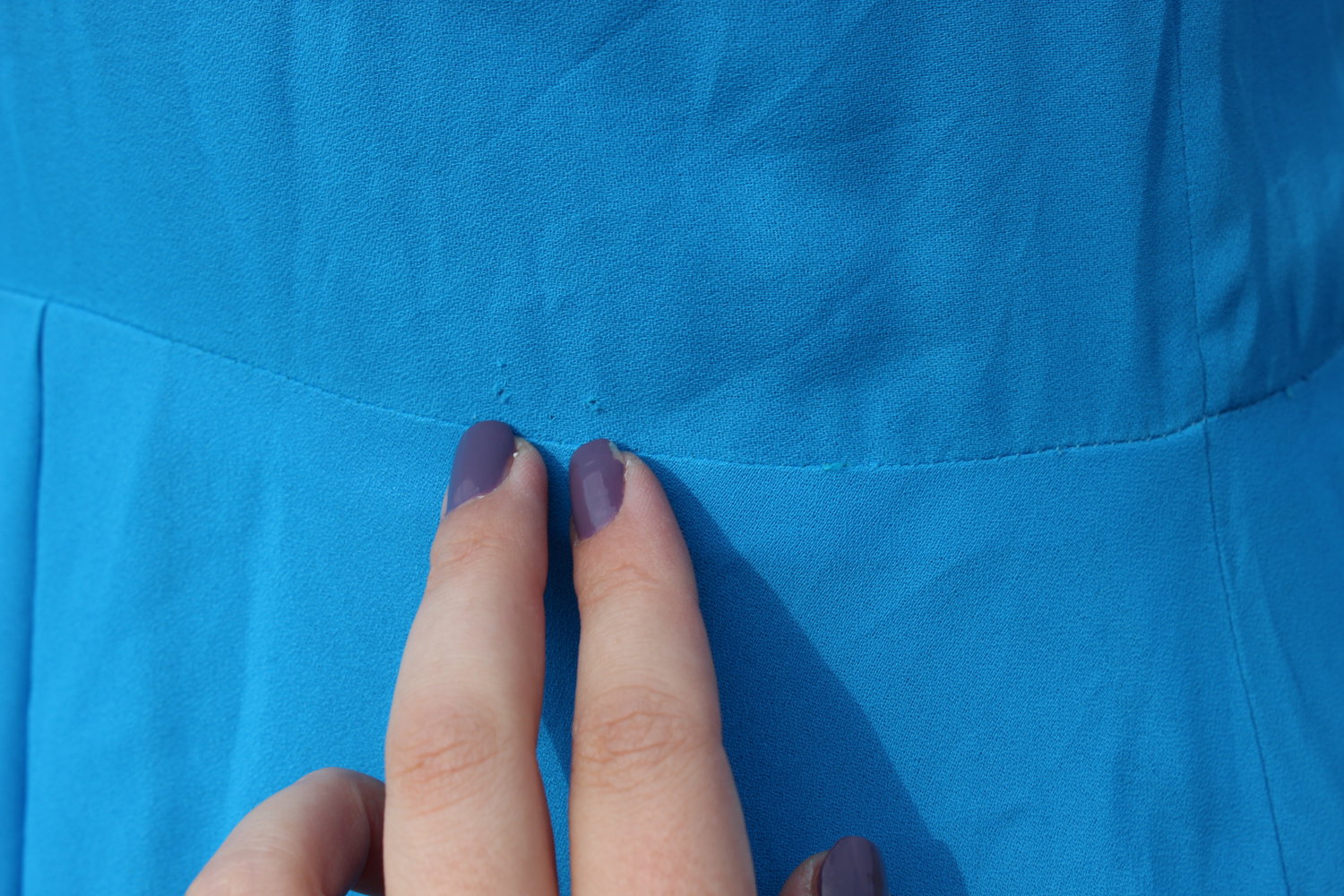 Das Kleid hat einen Minifehler im Stoff und einen 2 cm langen dunklen Strich (Fleck? evtl. entfernbar?).