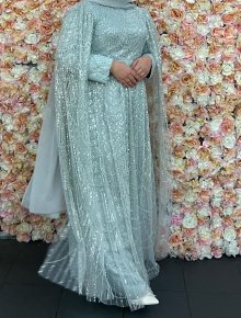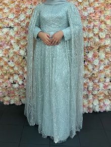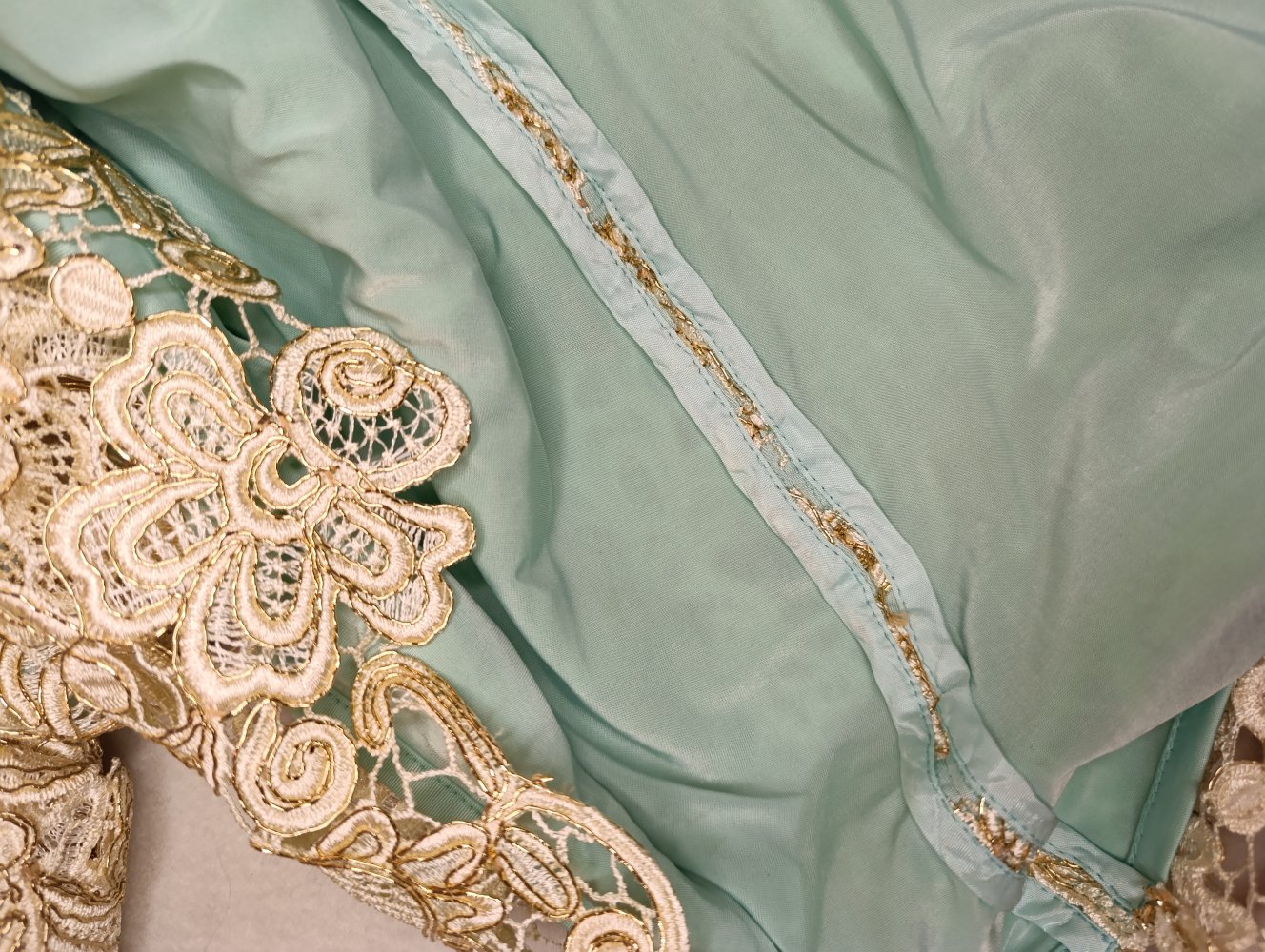 Wunderschönes, elegantes Spitzenkleid in Türkis/Mint mit luxuriöser Goldstickerei