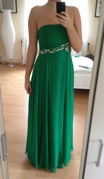 Biete hier ein wunderschönes, bodenlanges, trägerloses Abendkleid von Unique. Ich habe es nur einen Abend getragen. Ich bin ca. 1,80m groß mit hohen Schuhen, die Länge des Kleides wurde dementsprechend angepasst. Man kann es aber nach wie vor beliebig ändern lassen. Das Oberteil ist mit Steinen und Perlen beschmückt, was ein echter Hingucker ist. Es wird mit einem Reisverschluss und einem Haken verschlossen. Durch den schnitt fällt es unten sehr schön. Das Grün ist in echt noch etwas intensiver als auf den Bildern. Keinerlei Mängel.