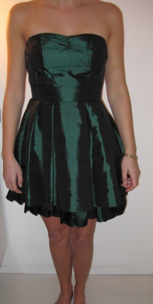 Da ich es doch noch nie angezogen habe, verkaufe ich dieses ungetragene kurze, dunkelgrüne Cocktailkleid von H&M, Größe 34. Die Träger sind abnehmbar, es kann also wahlweise auch komplett schulterfrei getragen werden. In das Oberteil, das eher eng geschnitten ist, sind Korsagenstäbchen eingearbeitet und durch einen kleinen Silikonrand oben rutscht es auch ohne Träger nicht. Der Grünton ist etwas weniger blaustichig als auf den Fotos, das Grün ist satter und wärmer. Der Rock, der durch eine Tülllage etwas bauschig ist, endet ca. auf der Mitte des Oberschenkels, das Kleid ist also recht knapp. Es hat eine kleine Macke, die mir beim Kauf leider nicht aufgefallen ist (s. Foto), und die allerdings wirklich nur bei SEHR genauem Hinsehen auffällt: An der linken Seite drückt sich das Korsagenstäbchen unten etwas durch, dort ist der Stoff ein wenig heller (ca.2mm)