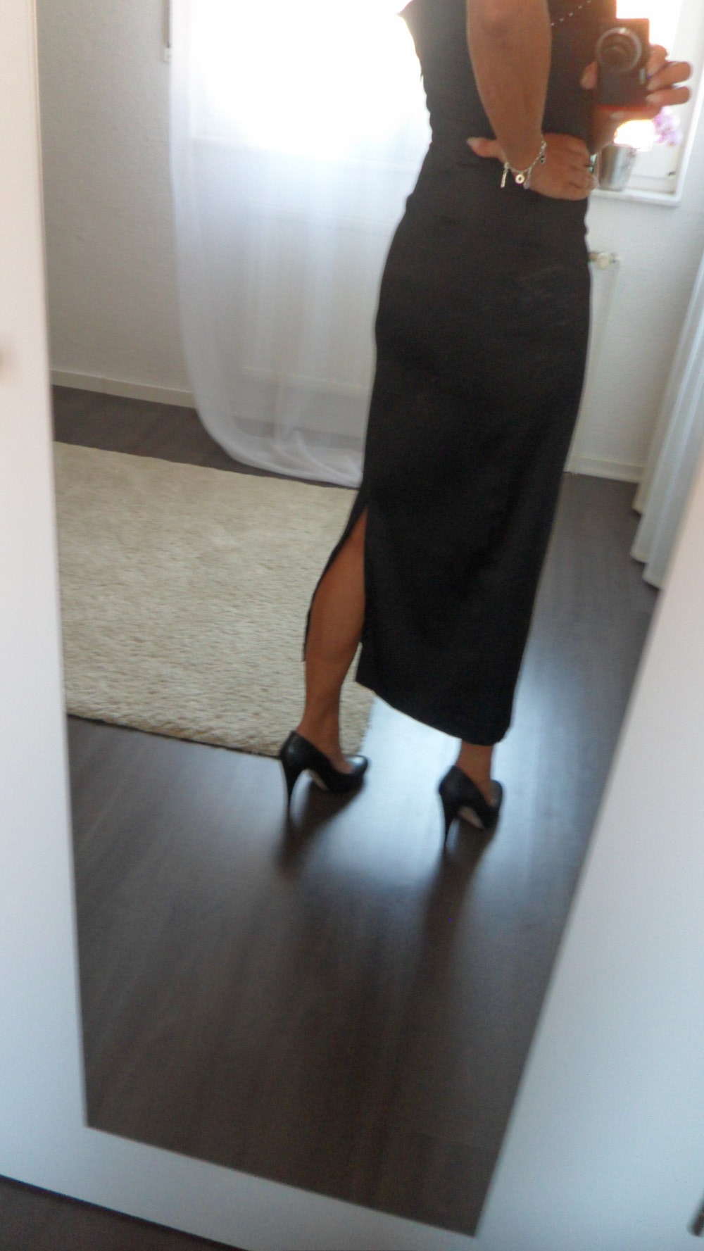 Das Kleid ist einfach wunderschön, schlicht gearbeitet, vorne mit Glitzerstein- Reihen und hinten mit langem Schlitz.