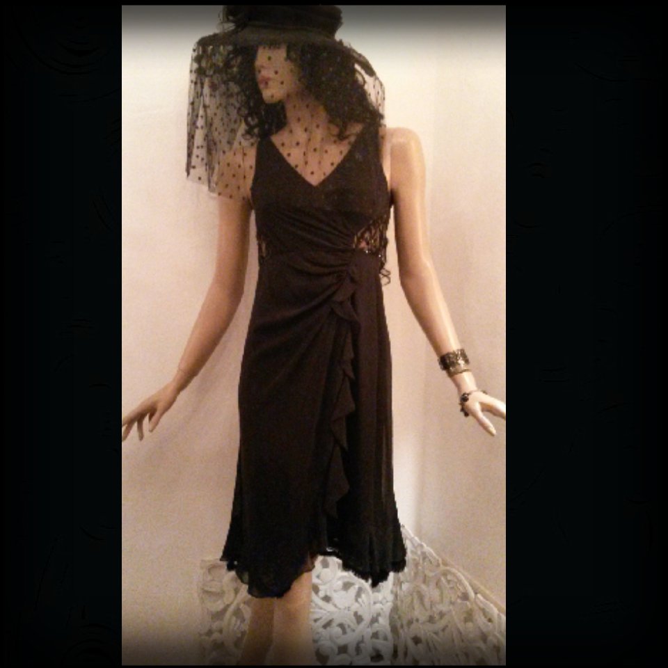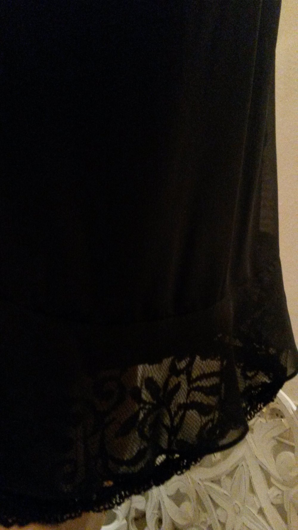 Edles tiefschwarzes Kleid mit Volants, Spitzeneinsatz, Perlen und Pailletten