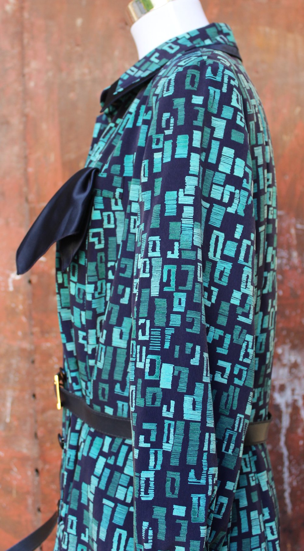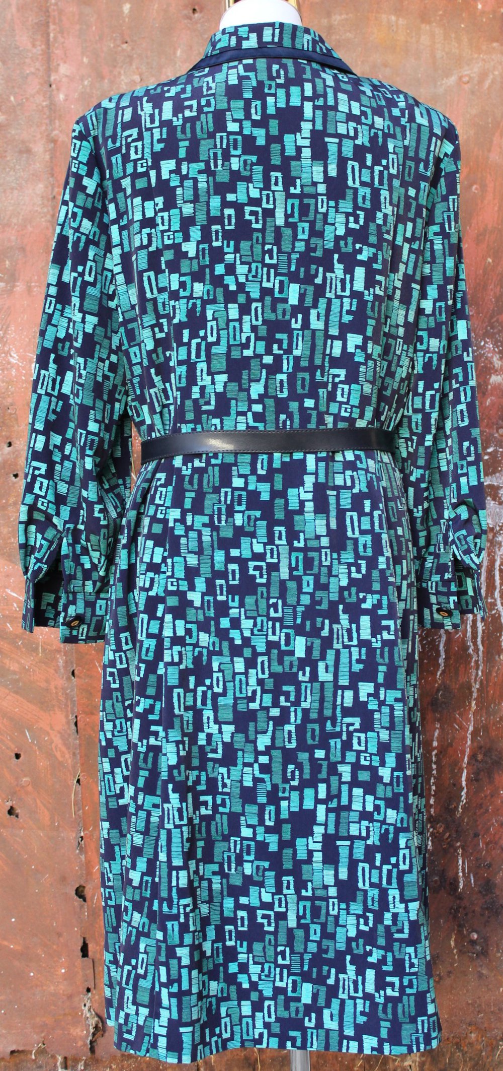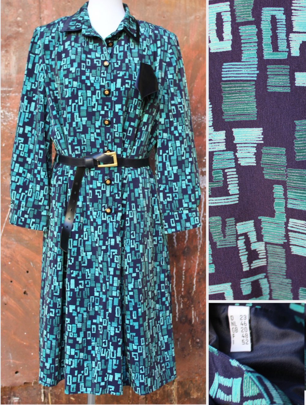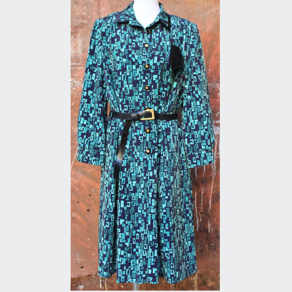 dunkelblau türkises Vintagekleid mit Muster, Kurzgröße 23 bzw. Größe 46