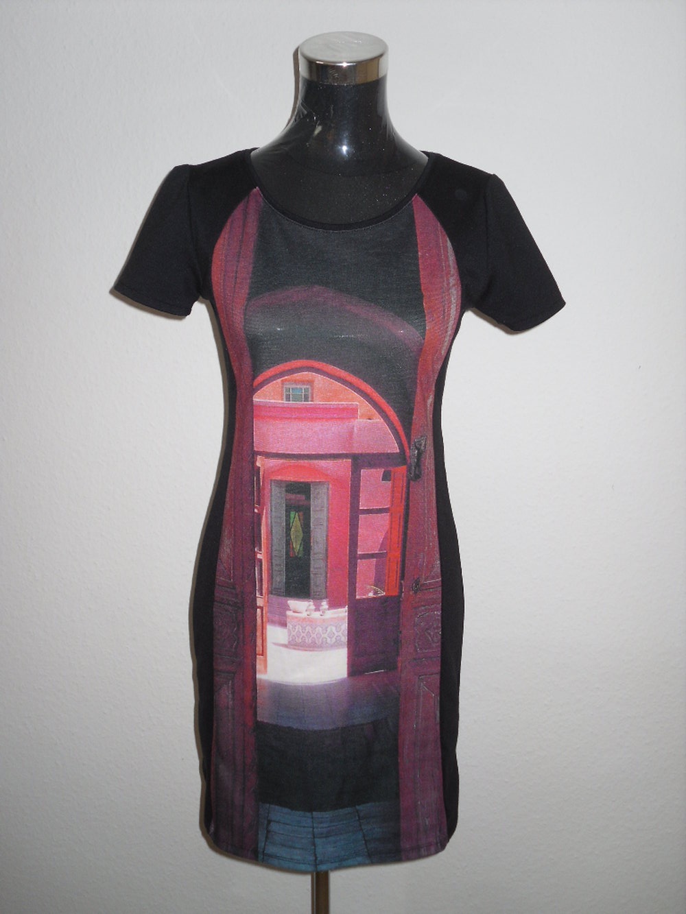 wunderschön - sehr gepfelgt - passt leider nicht mehr - stretch Kleid - kurzarm, aber für jede Jahreszeit geeignet, einfach T-Shirt oder Rolli drunter - vorn mit ansprechendem Muster - hinten schwarz - leicht taiilliert - mit M ausgezeichnet, passte Gr. S 38 perfekt - Gr. M ist es zu figurbetont - Maschinenwäsche bei 30°C