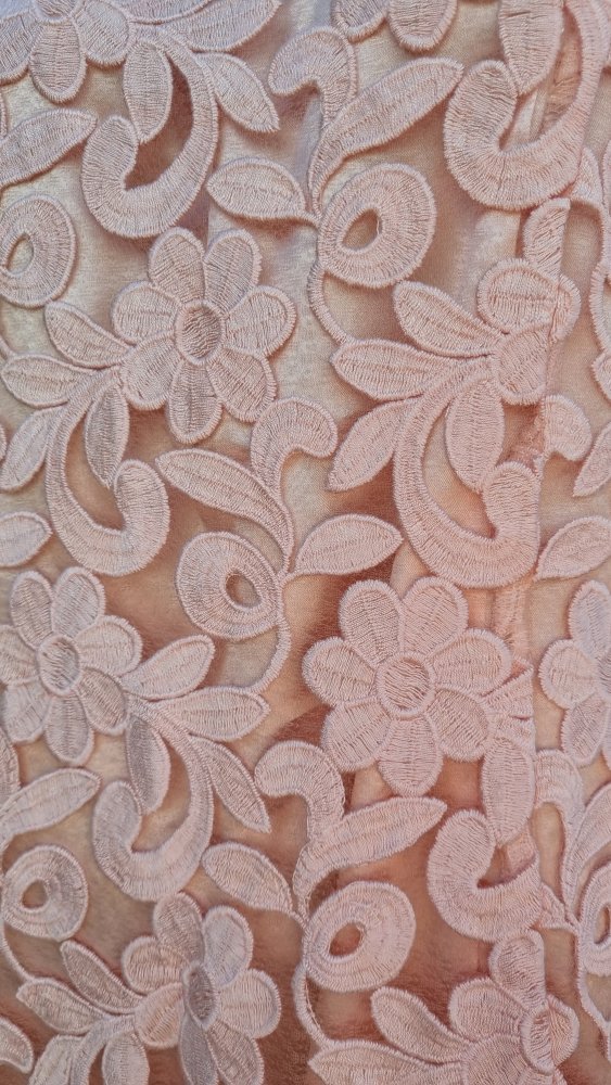 von Achsel zu Achsel ca 48 cm. Taille ca 45 cm. Laenge ab Schulter ca 106 cm. Farbe ist Aprikose.