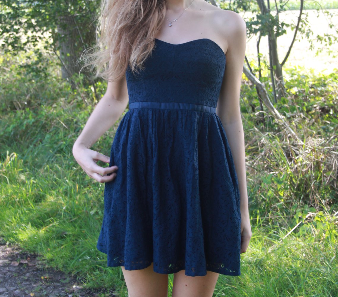 Ein wunderschönes trägerloses Kleid, das ich für einen ganz bestimmten Anlass ewig gesucht, gefunden, und dann doch nie getragen habe. Auch, wenn es bei mir nur im Schrank liegt, würde ich mich nie davon trennen, bräuchte ich nicht das Geld... eure Chance! Der Neupreis lag bei ca. 120€. Ich habe mich so in das Kleid verliebt, weil es einerseits sehr schick und verspielt, durch den "casual" Stoff aber doch unauffällig, klassisch wirkt, wieder aufgewertet durch das matt schimmernde, geriffelte Satinband auf Taillenhöhe. Unter dem "robusten" Spitzenstoff verbergen sich unten 2 weitere Stofflagen (s. Bild), die den Rock leicht ausstellen und somit die anliegende Taille noch mehr betonen (und beim Drehen/Tanzen herrlich mitschwingen). Der obere Teil schließt hinten mit einem verdeckten Reißverschluss und Öse und wird druch Stäbchen verstärkt. Der Ausschnitt ist herzförmig und sorgt für ein sehr schönes Dekollete. Die Farbe ist auf Fotos schwer einzufangen, es handelt sich um ein tiefdunkles Blau. Mein persönliches highlight sind die versteckten Eingrifsstaschen im Rock, in denen man die Hände verschwinden lassen kann :) Die Länge messe ich euch bei Interesse gerne aus; als Anhaltspunkt: Tragebilder bei einer Körpergröße von 175cm. Meldet euch auch gerne bei anderen Fragen, der Preis ist noch verhandelbar!
