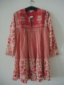 Wunderschönes Folklore-Kleid von Staring at Stars via Urban Outfitters/UO. Gesteppte Passe, verzierte Bindebänder, Tolle Farbgebung in Koralle und Nude. Ein echter Sommernachtstraum, wunderschön zu Boots aber auch Sandalen.