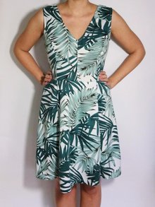 Sommerkleid von H&M mit tropischen Blätterprint. Das Kleid hat vorne und hinten einen V-Ausschnitt und ist aus dickem, festem Stoff.