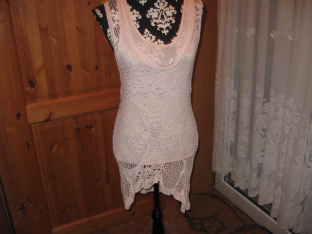 Biete ein hübsches Teilchen, unten Shirt, oben gehäkeltes, längeres, zipfliges Überziehteil, in einem zarten hellem Rosé Ton. Es ist eng anliegend, fällt kleiner aus...dehnt sich aber. Die präzise Länge, vorne kurz, seitlich länger. Hier einige Maßangaben: