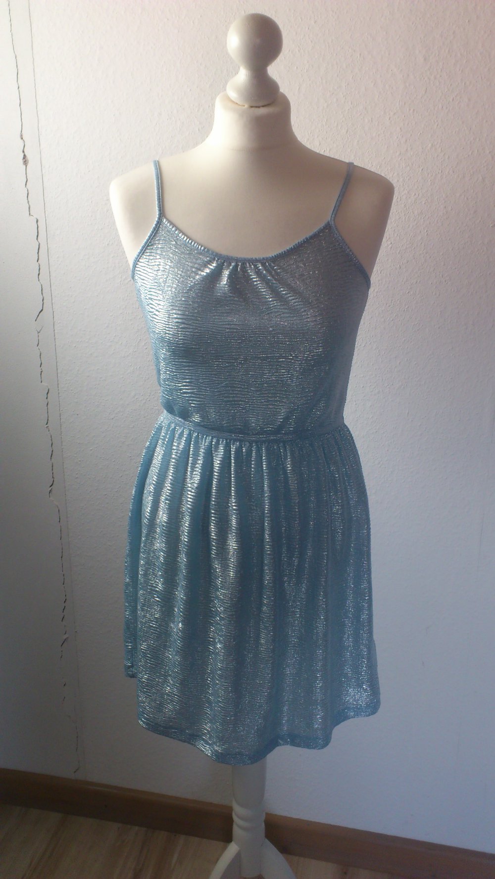Hellblau-silbernes Kleid von H&M. Es ist etwa knielang und hat in der Tallie einen flexiblen Bund für optimale Passform. Die Träger sind in der Länge verstellbar. Eigentlich ist es Größe 164 (also Kinder), kann aber super von einer XS/S getragen werden. Drunter sollte man eher helle Unterwäsche tragen, dunkle scheint leicht durch. Durch die Farbe sieht es besonders toll zu gebräunter Haut aus.