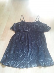 festlich elegantes und dennoch sportliches und bequemes Kleid mit Glitzerdetails an Ärmeln, Seiten, Ausschnitt und Taille. Kordelzug auf Hüfthöhe, verdeckter Reißverschluß hinten, zwei Taschen mit verdecktem Reißverschluß. Rockteil gefüttert. Nur einmal auf einer Hochzeit getragen.
