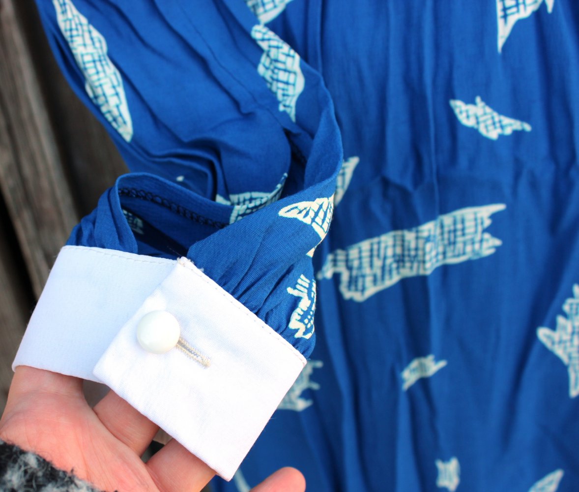 *) Auf seinem blauen (mittelblauen) Stoff befindet sich ein weiß-cremefarbenes abstraktes Muster.