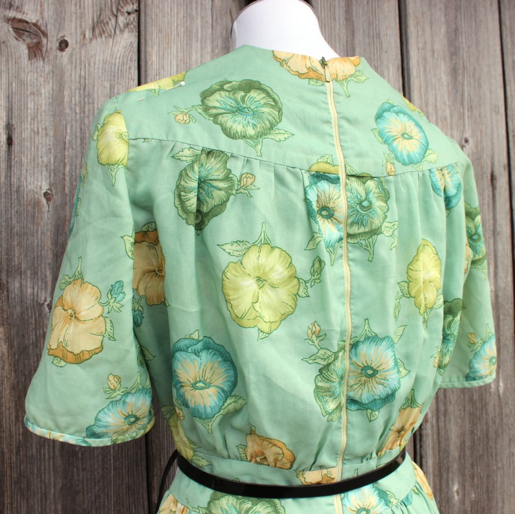 True Vintage, Vintagekleid, Unikat, Einzelstück, selbstgenäht, Blumenmuster, mintgrün, hochgeschlossen, tailliert, weiter Rock, 1950er, Fifties, Rockabilly, Rockabella