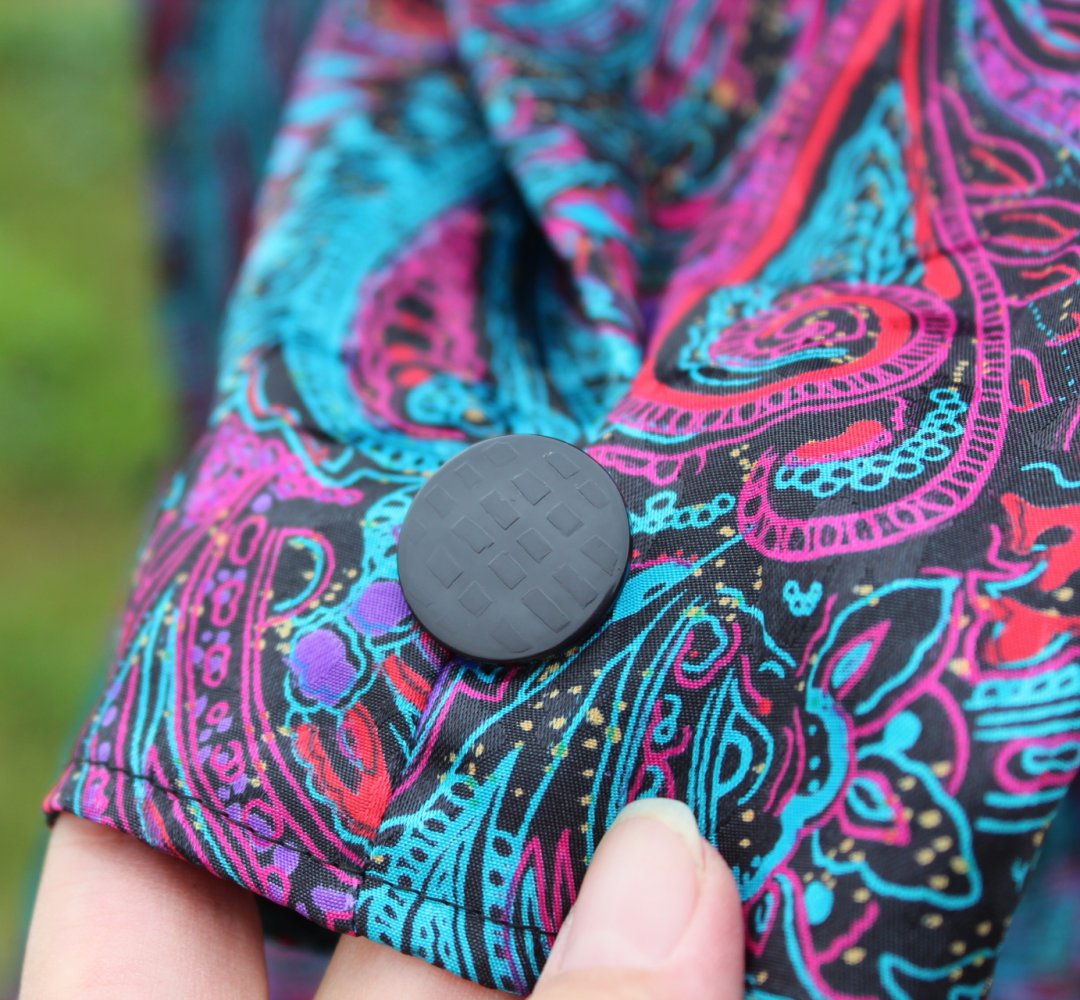 *) Auf einem schwarzen Grund findet sich ein Paisleymuster in rosa, lila, rot und türkis.
