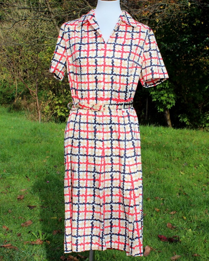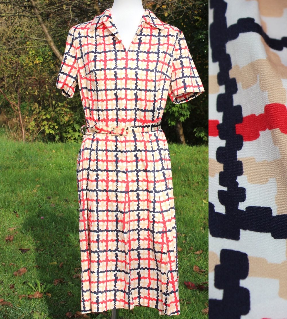 cremefarbenes True Vintage Kleid mit Muster in rot und blau, Unikat, ca. Größe 46
