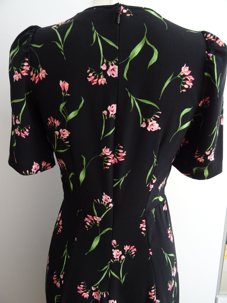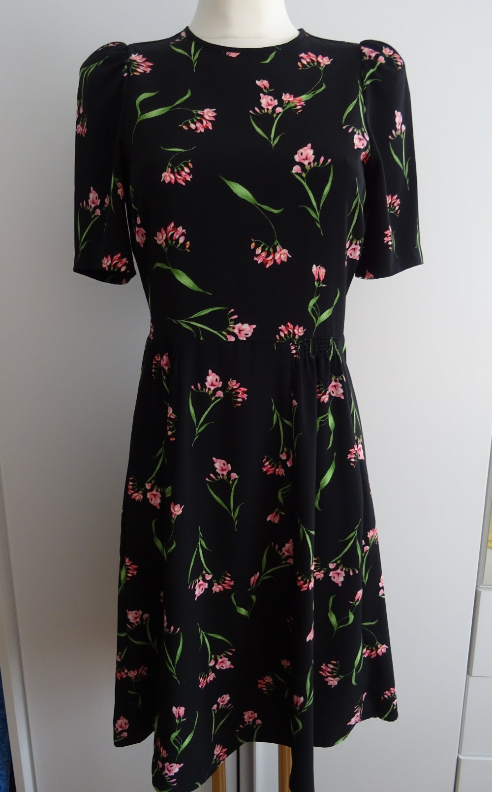 Ungetragenes schwarzes Kleid mit Blumenmuster.