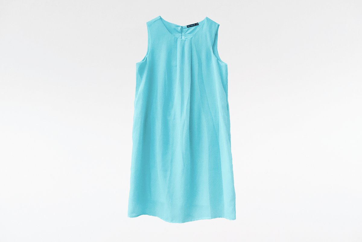 Ärmelloses, türkises Sommerkleid mit Rundhals-Ausschnitt in der Konfektionsgröße XS bzw. 34 von Terranova. Der Oberstoff ist aus weich fallendem Chiffon, aus 100 % Polyester gefertigt und die Gesamtlänge beträgt ca. 85 cm. Das Kleid hat zwei kleine seitlich angebrachte Schlaufen und kann auch mit einem Gürtel getragen werden. Es ist am Rücken mit einem kleinen Knopf verschließbar.