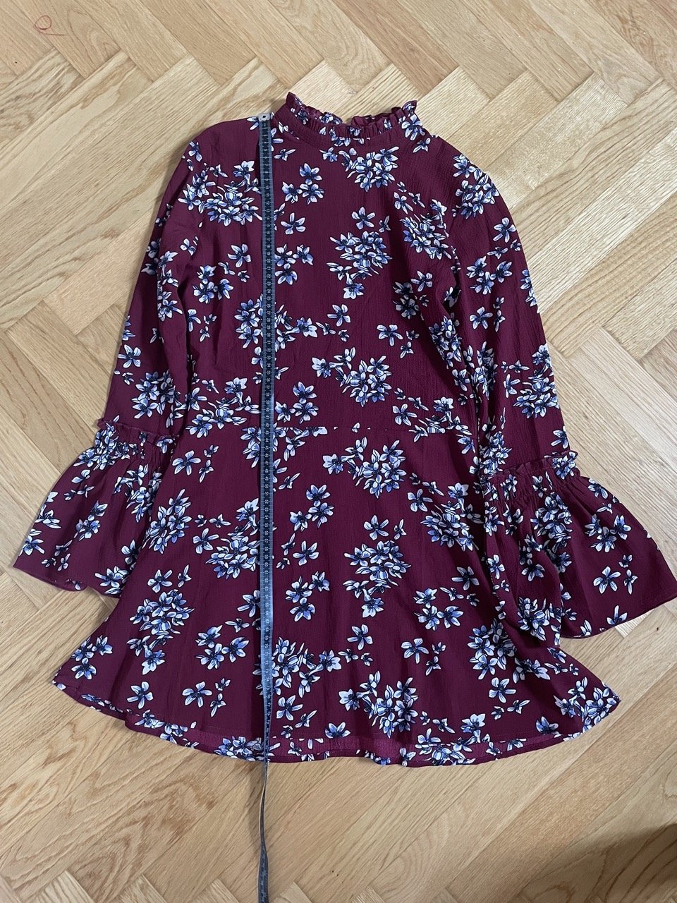 1x getragenes Kleid mit langen Ärmeln, die am Ende etwas weiter sind (Trompetenärmel). Es ist oben mit einem kleinen, leicht gerüschten Kragen etwas höher geschlossen.