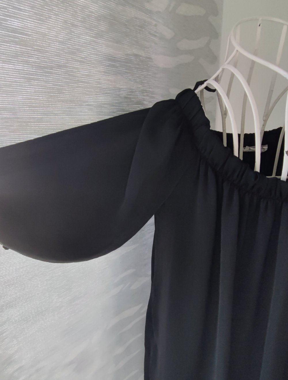 Schwarzes Kleid mit Carmen-Ausschnitt (ohne Gürtel), mit 3/4-Ärmeln, locker leicht fallend, mit Unterkleid, mit Seitentaschen