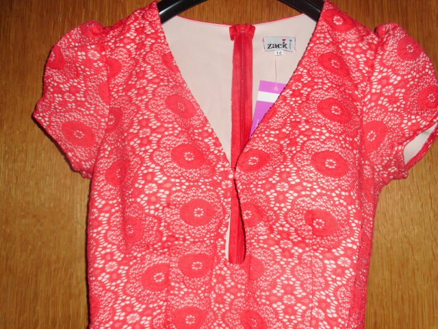 Biete hier ein Spitzenkleid von John Zack London in Gr. 40 an. Es ist zwar mit Gr. 42 ( US10 Eng. 14) angegeben, aber es fällt etwas kleiner aus wie 42, ich gebe unten noch die Maße an. Das Kleid ist aus einer roten Spitze, darunter ist es mit einem hautfarbigen, blickdichten Stoff versehen. Es hat kurze Ärmel und vorn einen raffinierten Ausschnitt. Dazu hat das Kleid leicht vorgeformte Softcups. Das Kleid wird hinten mit einem Reißverschluss geschlossen. Es ist strechig und sitzt körperbetont. Das Kleid ist neu, ungetragen und noch mit Etikett versehen.