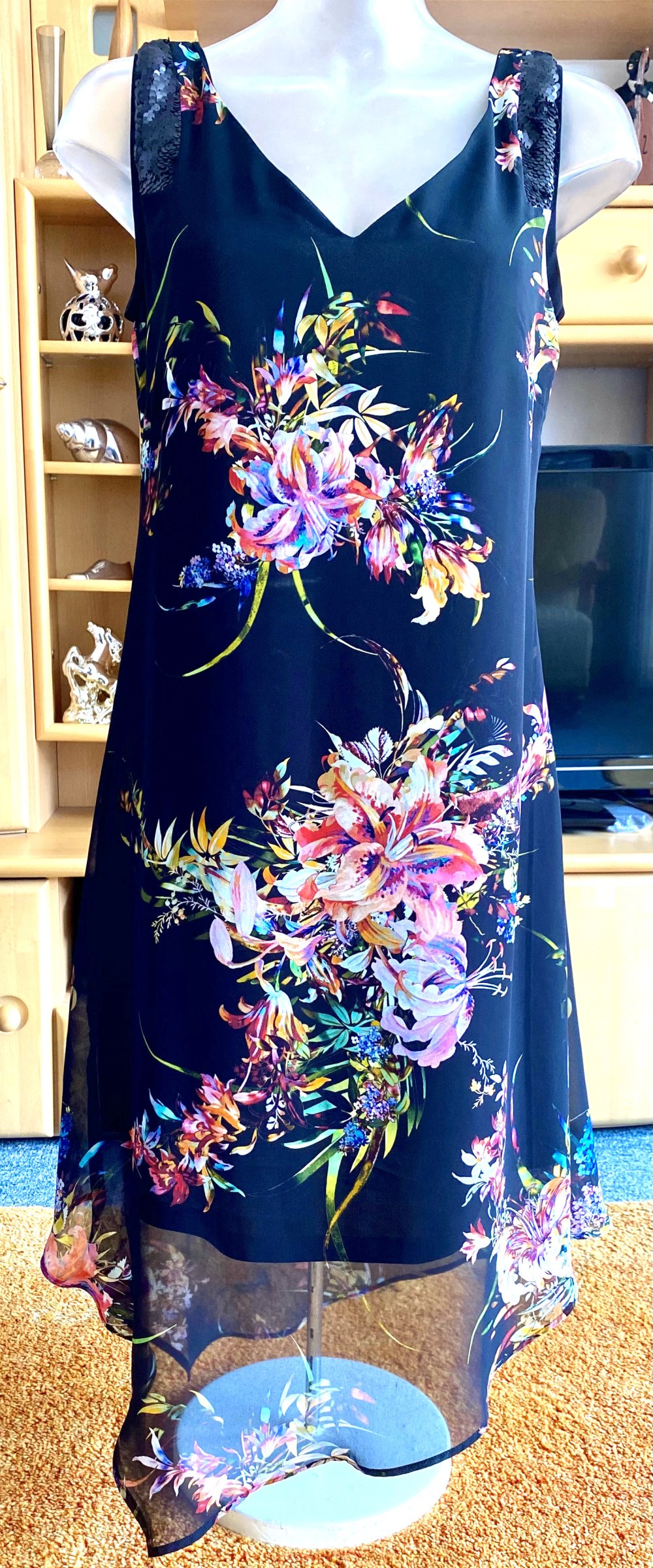 Leicht, verspielt und hochwertig: Dieses wunderschöne Sommerkleid von Monari überzeugt mit seinem fließenden Zipfelschnitt, femininer A-Linie und stilvoller Paillettenverzierung. Ein echtes Highlight für warme Tage – und mit Langarmshirt & Stiefeln auch in der Übergangszeit tragbar.