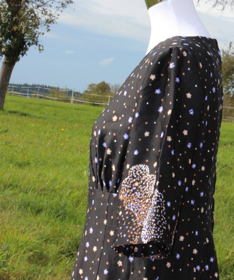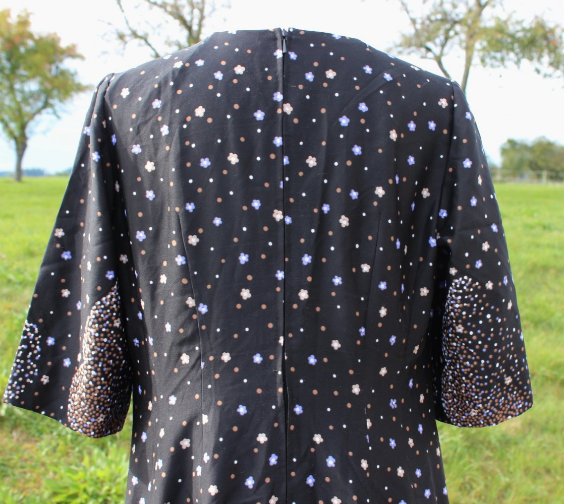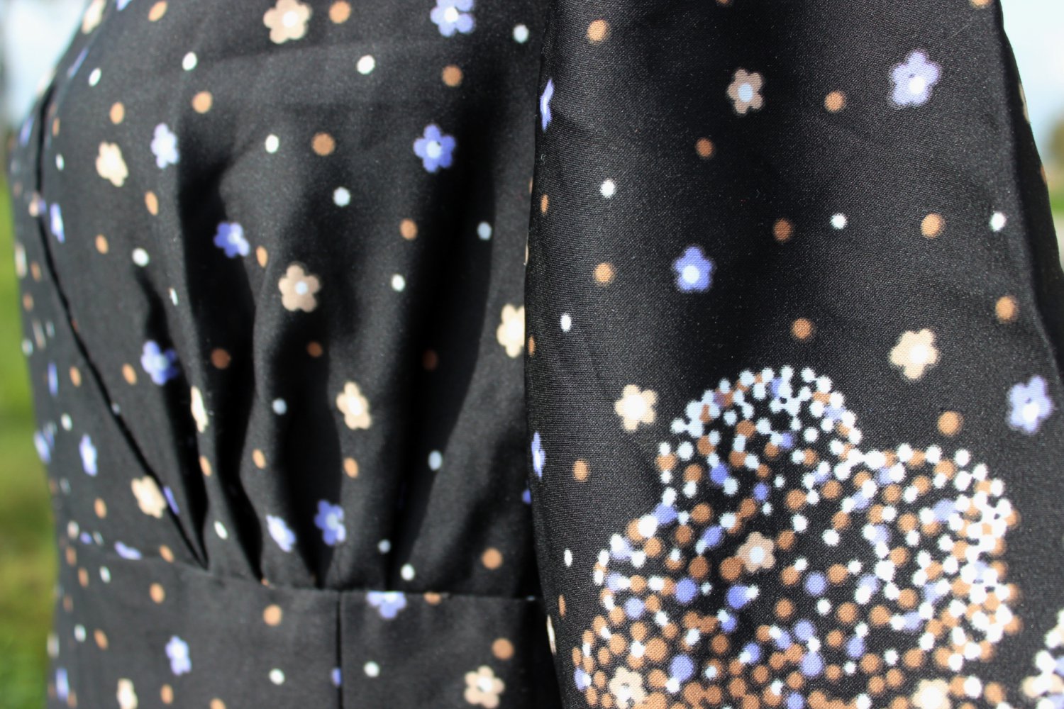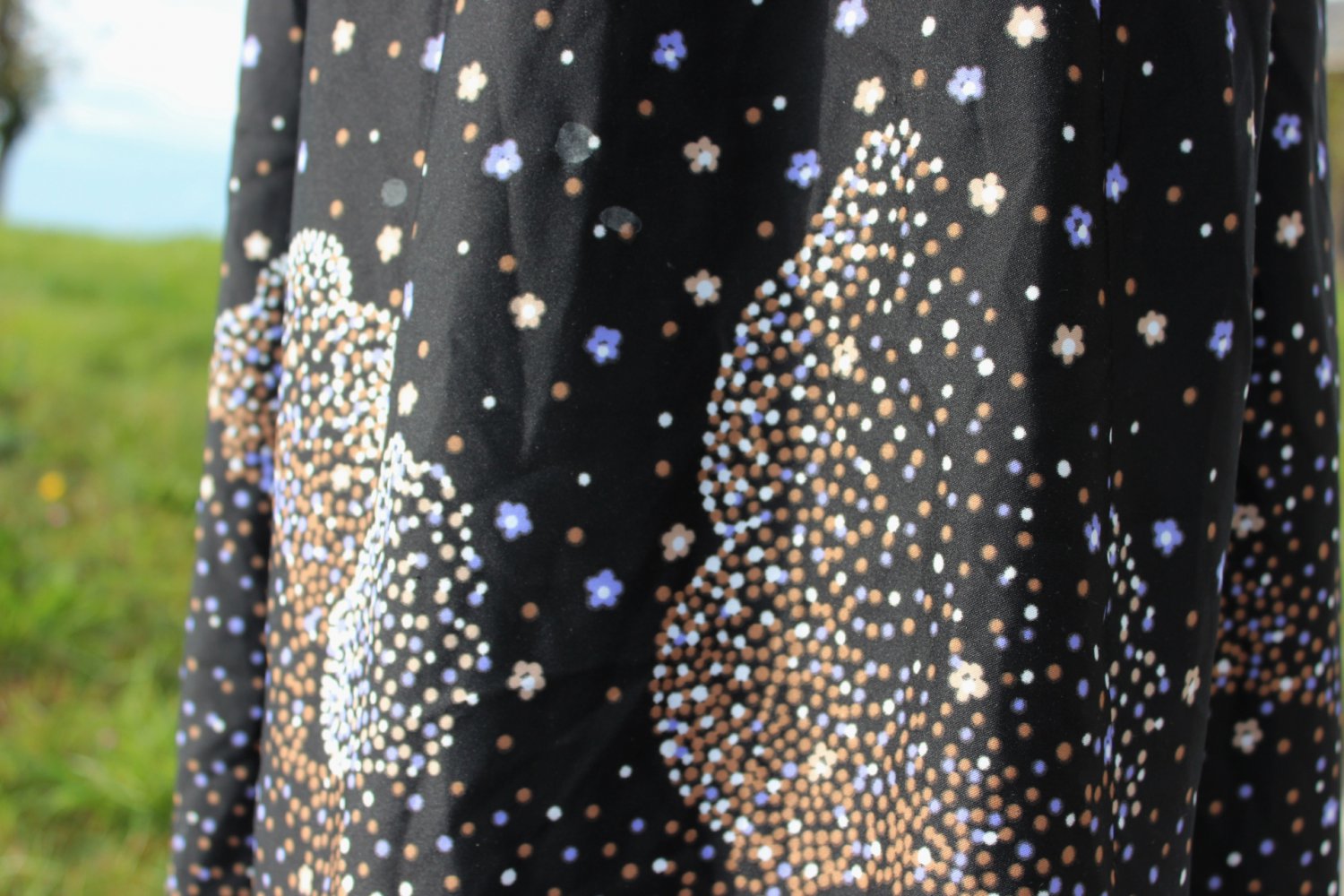 *) Das schwarze Kleid hat ein Muster aus kleinen Blumen und Punkten in weiß, braun und lila (Blumenmuster, Polkadots).