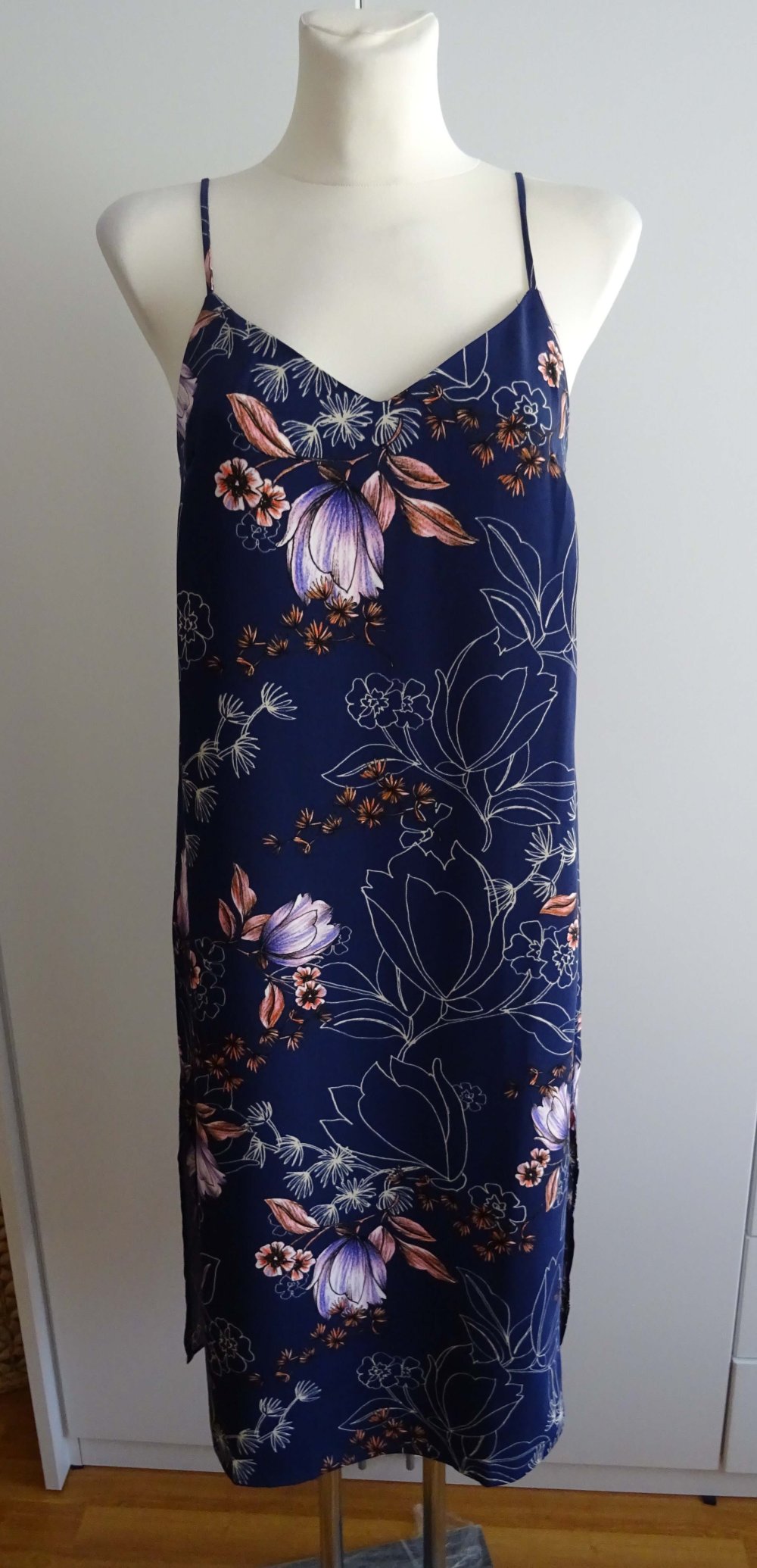 Ungetragenes blaues Kleid mit Blumenmotiv. Das Kleid ist seitlich geschlitzt.
