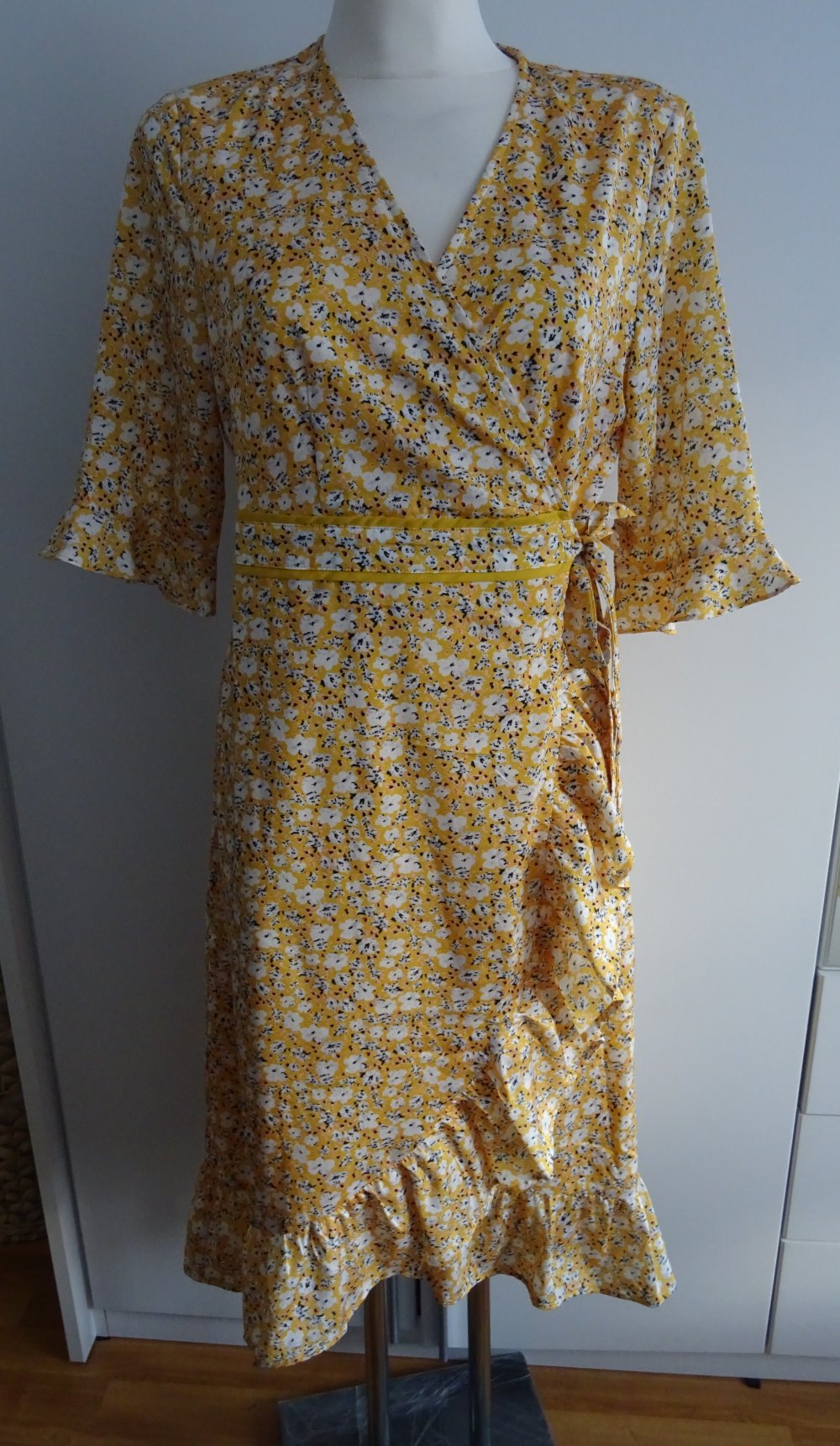 Ungetragenes gelbes Wickelkleid mit Blumenmuster.