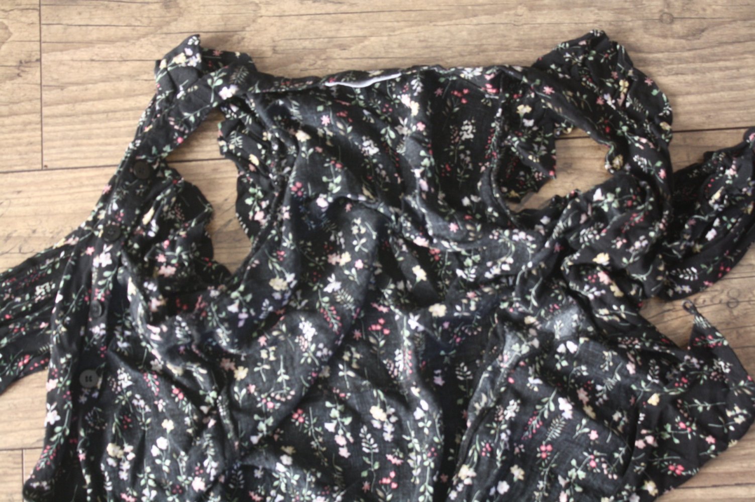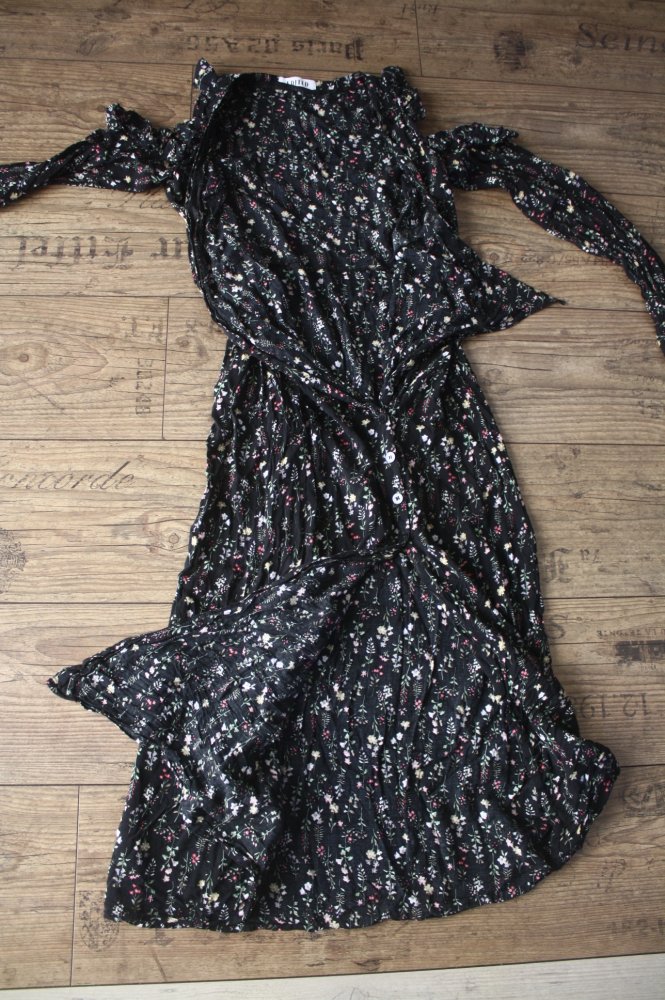 Das Kleid hat Cut Outs an den Schultern und wird vorne einmal gewickelt um die Brust u mit einem Knopf befestigt. Dann wird es zugeknöpft. Hat XS , passt bei 34 36